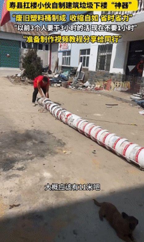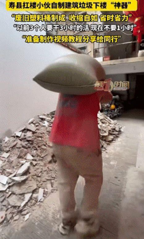 “不愧是劳动人民!”安徽寿县,一小伙每天干着扛楼搬运建筑垃圾的苦力活,累得浑身是伤。为了省力,他竟找来37个废旧塑料桶,切掉底座连成11米长的“高空滑梯”,原本3个人得搬2到3个小时的2吨垃圾,现在1个人不到1个小时就能搞定!网友:这脑子不用来考清华可惜了! 安徽寿县的这位年轻小伙,平时的工作就是帮人清理搬运建筑垃圾。 装修拆下来的砖渣、水泥块和碎瓷砖,全得装进蛇皮袋里,一袋袋从楼上扛到楼下。这活儿听着简单,干起来简直要命。那些砖渣又重又扎人,装在袋子里全是支棱出来的棱角,重重地硌在肩膀上。 每天上上下下跑几十趟,碰着哪儿哪儿疼,一天活干下来,小伙的肩膀和脖颈全是血印和勒伤,整个人累得瘫软孬掉。 有一天,他正蹲在楼梯口抽烟歇气,看着手里的烟头突然冒出一个念头:垃圾明明是往下丢的,人为什么要死死地扛着它走楼梯?要是能让它自己滑下去不就行了? 这念头一旦冒出来,就在脑子里彻底扎了根。 他跑去四处收集了一堆装修剩下的废旧涂料大塑料桶,把每个桶的底座切掉,一个套一个死死卡住,连成了一条长长的巨龙。他把这套装置从4楼窗户直接伸出去,一直通到楼下地面。 以后干活,垃圾往桶口一倒,哗啦一声就顺着管道自己滑下去了。 最让人拍案叫绝的是,这套塑料桶滑梯还能自由伸缩。 37个桶全部拉直连接起来,足足有11米长,从4楼直通地面完全绰绰有余。等干完活往回一收,长龙瞬间缩成了一摞2米8高的圆筒,往墙角一塞,既不碍事也不占地方。 小伙子自己算了一笔账:以前清理4楼那2吨重的建筑垃圾,少说也得安排3个人来扛,连搬带歇,最快也得花上2到3个小时。现在用了这个滑梯,只需要1个人站在楼上往桶里倒,不到1个小时就能把现场收拾得干干净净。 这场自制“垃圾滑梯”的硬核操作,不仅展现了底层打工人的生存智慧,更让大家看到了劳动者在困境中求变的韧性。 有人说,这小伙子真是个人才,把物理知识运用到了极致,既保护了自己的身体,又大大提高了干活效率,这种接地气的发明就应该申请专利。 也有人认为,这办法虽然聪明,但看着挺吓人的,一旦中途断开后果不堪设想。 这事儿说到底,小伙子懂得思考和创新,确实值得点赞。 但我们在为这份聪明才智叫好的同时,也不能忽视其背后隐藏的巨大安全隐患。 用37个废旧塑料桶拼接而成的11米长管,虽然用起来顺手,但整体的牢固度根本无法得到绝对保障。 一旦遇到大风等恶劣天气,或者倾倒的砖渣过大过重,单薄老化的高空塑料桶极易发生破裂或脱节断裂。 几层楼高的地方如果掉下裹挟着建筑垃圾的塑料残片,对楼下的行人、车辆都会构成致命威胁。 想要安全又高效地清运建筑垃圾,不能仅靠工人们自己去“土法炼钢”。 真正稳妥的方式,是推广使用专业且符合安全标准的高空垃圾输送管道设备,或者在小区装修时由物业统一配备封闭式的专用升降机械。 只有在保障绝对安全的前提下提高效率,劳动者的智慧才能真正发光发热。 对此,你怎么看?