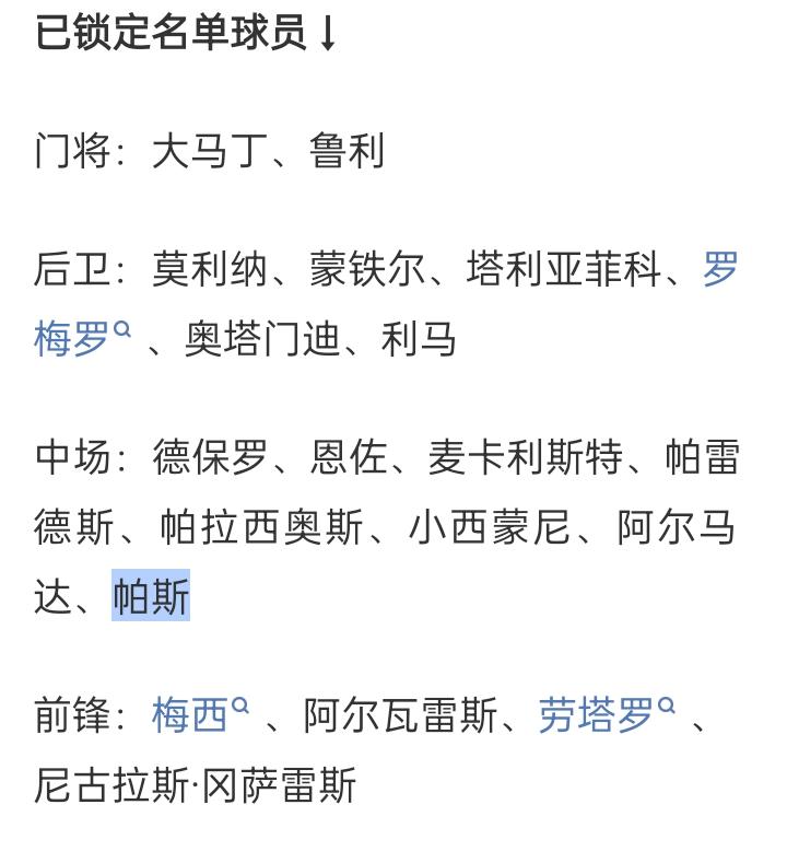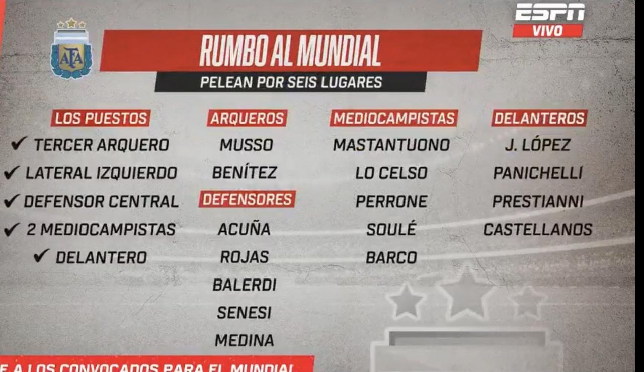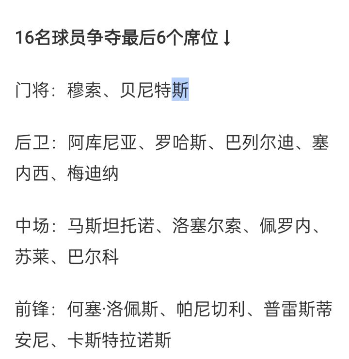 ESPN:阿根廷世界杯已锁定20席,最后6个名额将从16人中选出 03月26日 据ESPN阿根廷版报道,阿根廷世界杯已锁定20席位,剩余16名球员将争夺最后6个席位