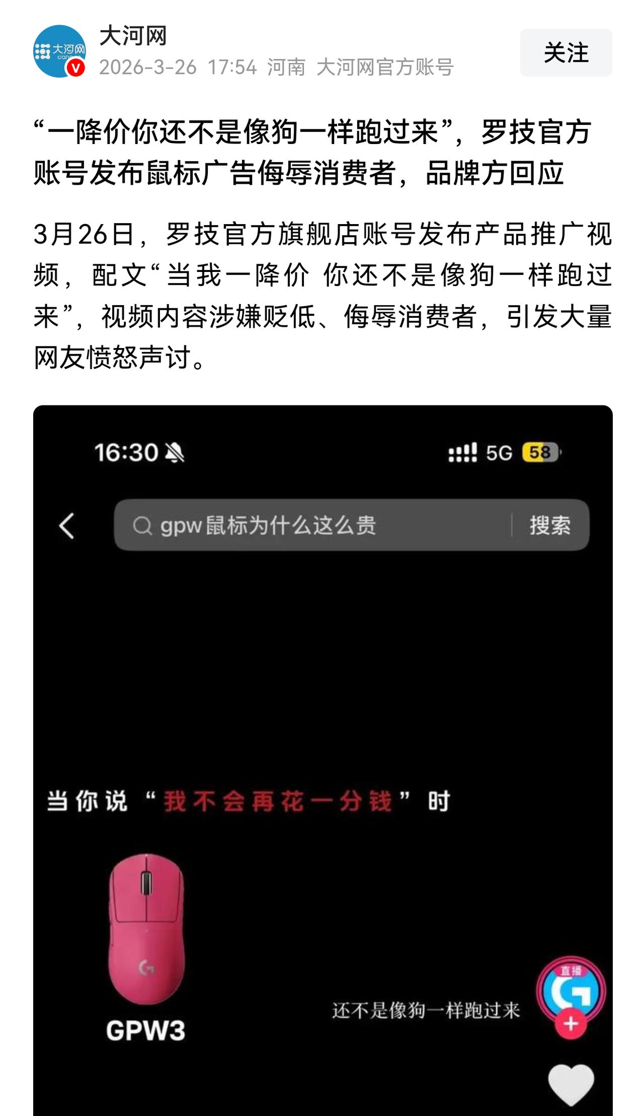 史上最逆天广告,“我一降价,你还不是像狗一样跑过来。”看字,还以为它是卖肉包子的呢,看图,原来是卖鼠标的。这比西贝老贾厉害多了,老贾最狠的一句话也不过是“不会求着客户来吃”。这罗鼠标,直接开骂啊,它是认为骂得越狠,,消费者买得越起劲吗? 别人都把消费者当上帝,他们是把消费者当流浪狗啊,卖货搞得施舍现场。 是消费者养活了它,相当于它的衣食父母,他骂消费者是狗,等于骂自己父母是狗,大逆不道啊。 查了下,这是家瑞士公司,中国区贡献了全球总营收的10%。按照瑞士老鬼的德性,应该是没把港澳台算进去,算进去估计到12%了。 这么大的客户群体,它竟然端起碗吃饭,放下碗骂娘,在商业辱华这一块,还有比它更嚣张的吗? 既然它不珍惜这12%,那就拜拜吧。大家千万要忍住,千万不要一降价就买,那就真被它说中了,就真成了狗了。