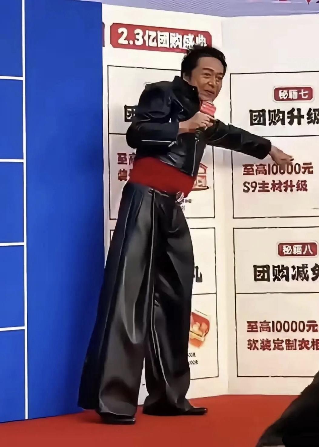 从当年琼瑶剧里的“咆哮帝”,到如今商演舞台上这身略显狼狈的造型,马景涛这几年的变化,真的让人感慨万千。 照片里,他穿着一身紧绷的黑色皮衣皮裤,内搭一件抢眼的红色毛衣,站在“2.3亿团购盛典”的背景板前。 上了年纪的他脸部浮肿,身材发福,本想靠皮衣撑气场,结果反而被勒出了明显的肚腩,头身比例看起来格外怪异。 这身搭配不仅没有当年的潇洒帅气,反而透着一股说不出的廉价和违和。 红黑配色土味十足,劣质皮料的光泽感更是拉低了整体档次,站在台上,注意力全被那身不合身的衣服和凸出的肚子吸引走了。 不是不允许中年艺人穿得随意,只是看着这样的马景涛,难免让人唏嘘。曾经那个玉树临风的梅若鸿,如今为了商演捞金,连基本的造型搭配都没人把关了。 或许是没人敢直言提醒,或许是他自己还沉浸在过去的状态里,才造就了这样一场让人不忍直视的造型翻车。 这份遗憾,既是造型的失败,也是岁月对每一个人的考验啊。