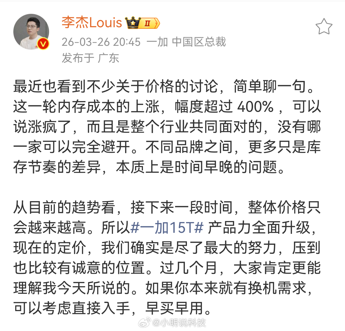 李杰表示,一加15T现在这个定价已经是尽了最大努力给到的诚意价了。内存成本涨得太吓人,涨幅都超400%了,大家要慢慢适应手机涨价这个趋势。按照新的内存成本来看,后续价格还会上涨,真有换机需求的话,早买早用更划算。