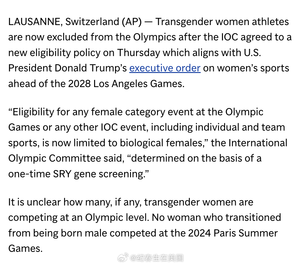 国际奥委会表示:“奥运会或任何其他IOC赛事中任何女性项目的参赛资格,包括个人项目和团体项目,现在仅限生物学女性,”并补充称,“这一认定将基于一次性的SRY基因筛查。”
