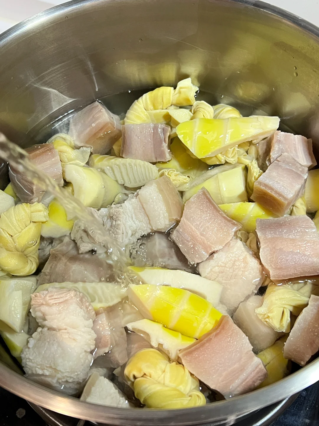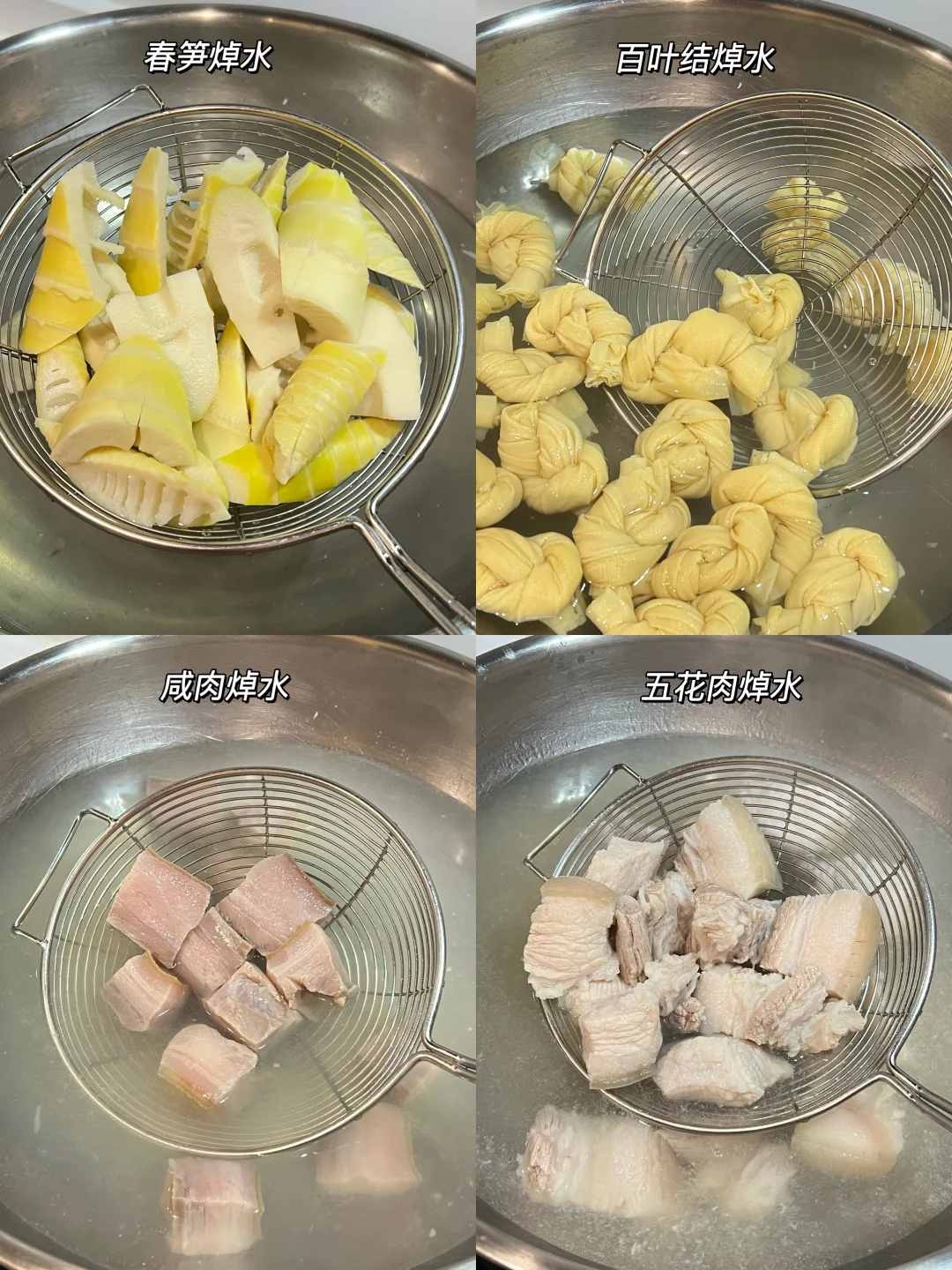 1️⃣春笋,百叶结,咸肉,五花肉焯水备用。