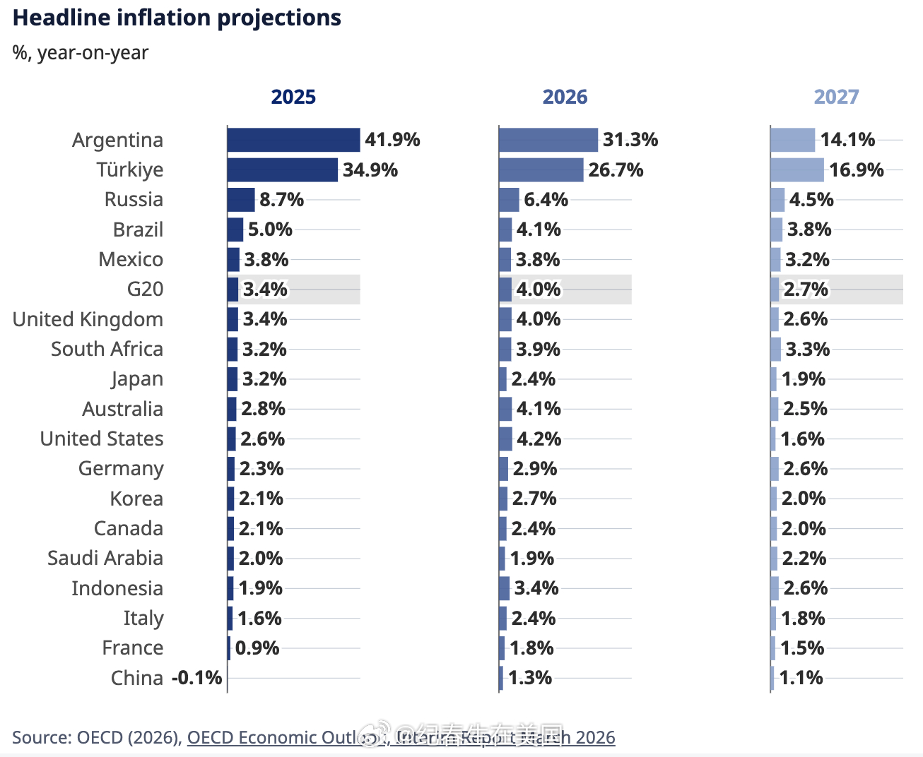 经合组织称,美国今年的通胀率预计平均为 4.2%,比去年底发布的此前预测高出 1 个多百分点。在二十国集团(G20)范围内,今年通胀预计平均为 4%,比此前预测高出 1.2 个百分点。