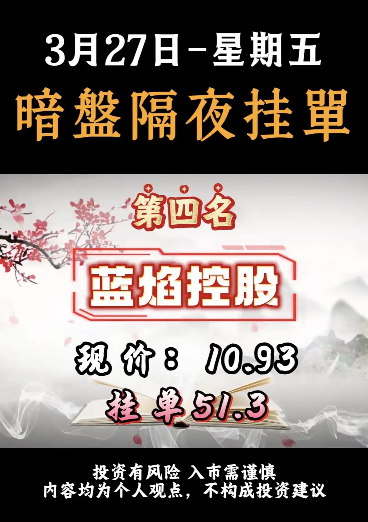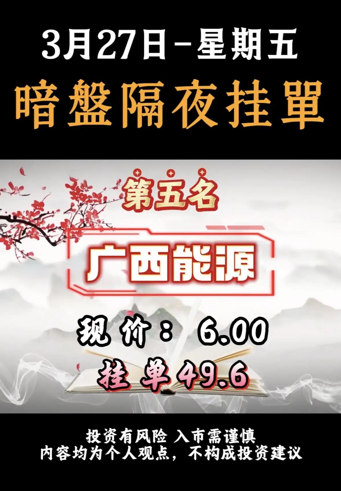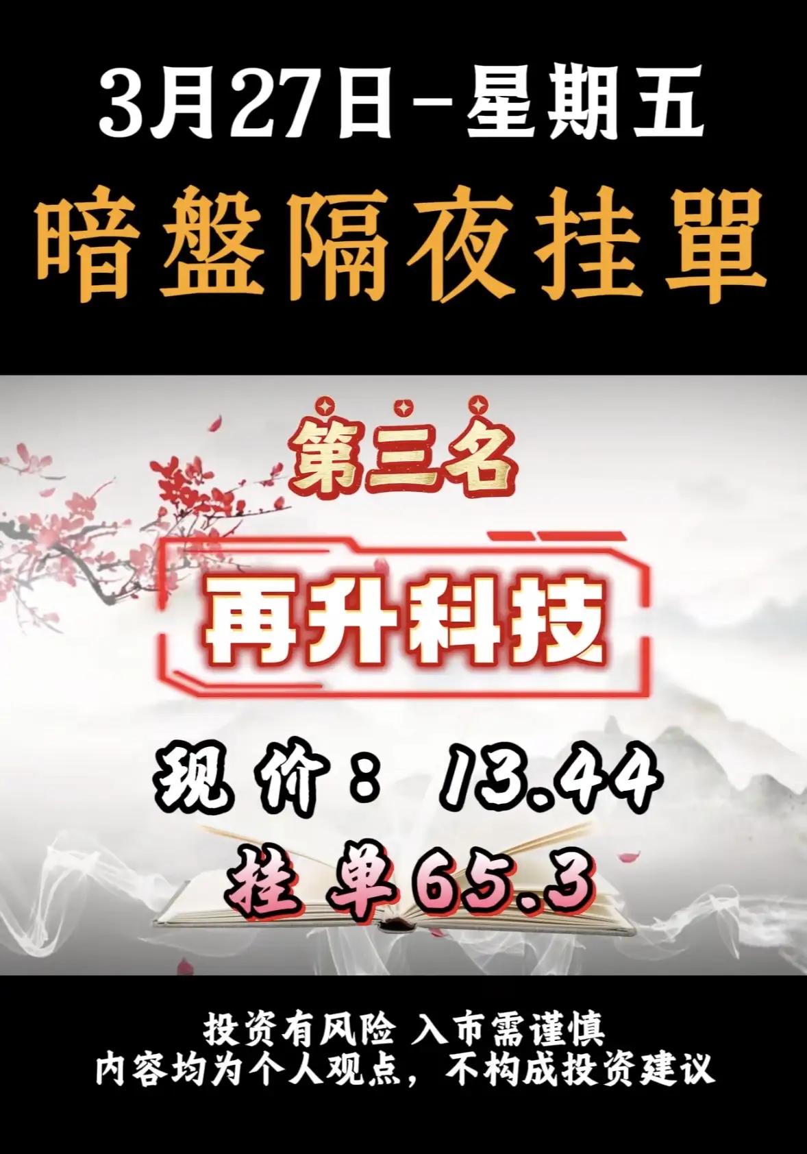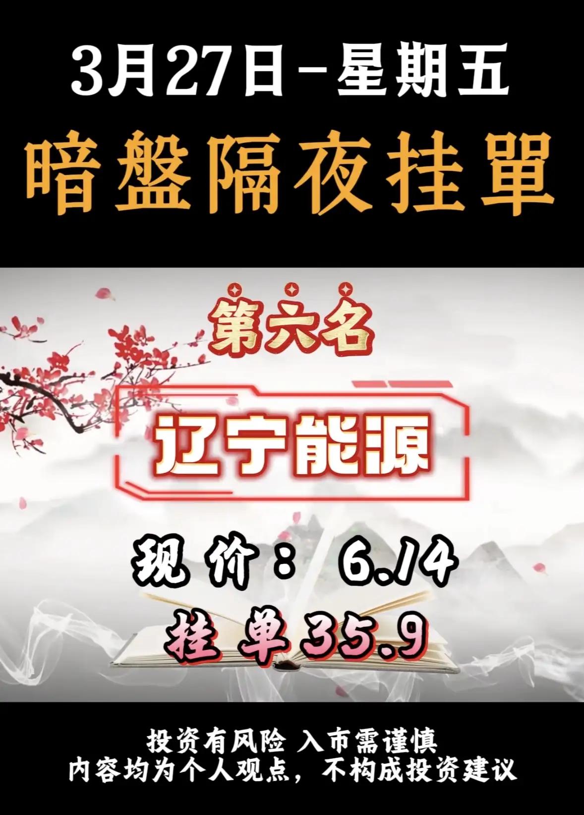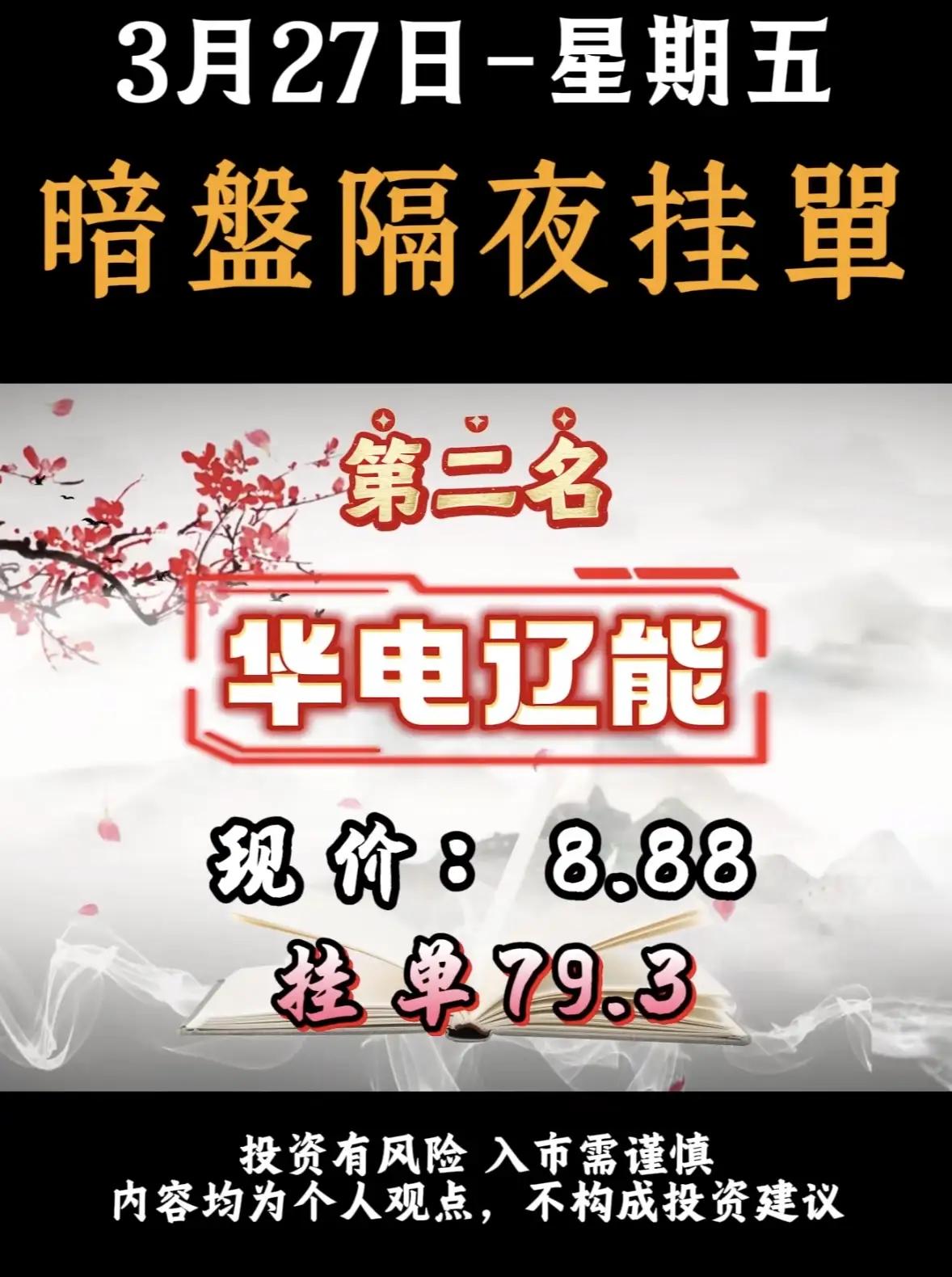 3月27日暗盘隔夜挂单排名解析!!! - 神剑股份:排名第一,现价12.40,挂单87.3亿。该公司涉及商业航天、无人机、聚酯树脂、地方国资等多重题材,资金对其在军工配套及新材料领域的布局给予积极反馈。 - 华电辽能:排名第二,现价8.88,挂单79.3亿。作为电力能源类企业,其高挂单金额可能与近期能源板块政策或市场预期有关。 - 再升科技:排名第三,现价13.44,挂单65.3亿。涉及SpaceX供货传闻、玻璃微纤维、高效滤材等题材,受益于商业航天产业链的外溢效应。 - 蓝焰控股:排名第四,现价10.93,挂单51.3亿。涉及煤层气、地缘冲突、山西国资等题材,资金对其在能源安全及地缘政治背景下的战略价值给予积极反馈。 - 广西能源:排名第五,现价6.00,挂单49.6亿。涵盖海上风电、算电协同、广西国资等题材,资金对其在新能源及算力基础设施建设中的布局给予积极反馈。 - 辽宁能源:排名第六,现价6.14,挂单35.9亿。该公司涉及电力、煤炭等传统能源领域,或与能源保供及国企改革预期相关。 投资提示 - 风险提示:暗盘交易属于场外交易,流动性较低,价格波动大,且挂单金额不代表实际成交金额,投资者需谨慎对待。 - 市场情绪:高挂单金额通常反映市场对该股票的短期关注度较高,但并不一定代表其长期投资价值。 - 行业分布:榜单中涵盖能源、科技、化工等多个行业,显示市场资金分散布局,无明显单一热点。 建议投资者在关注此类排名时,结合公司基本面、行业趋势及市场整体环境进行综合判断,避免盲目跟风。
