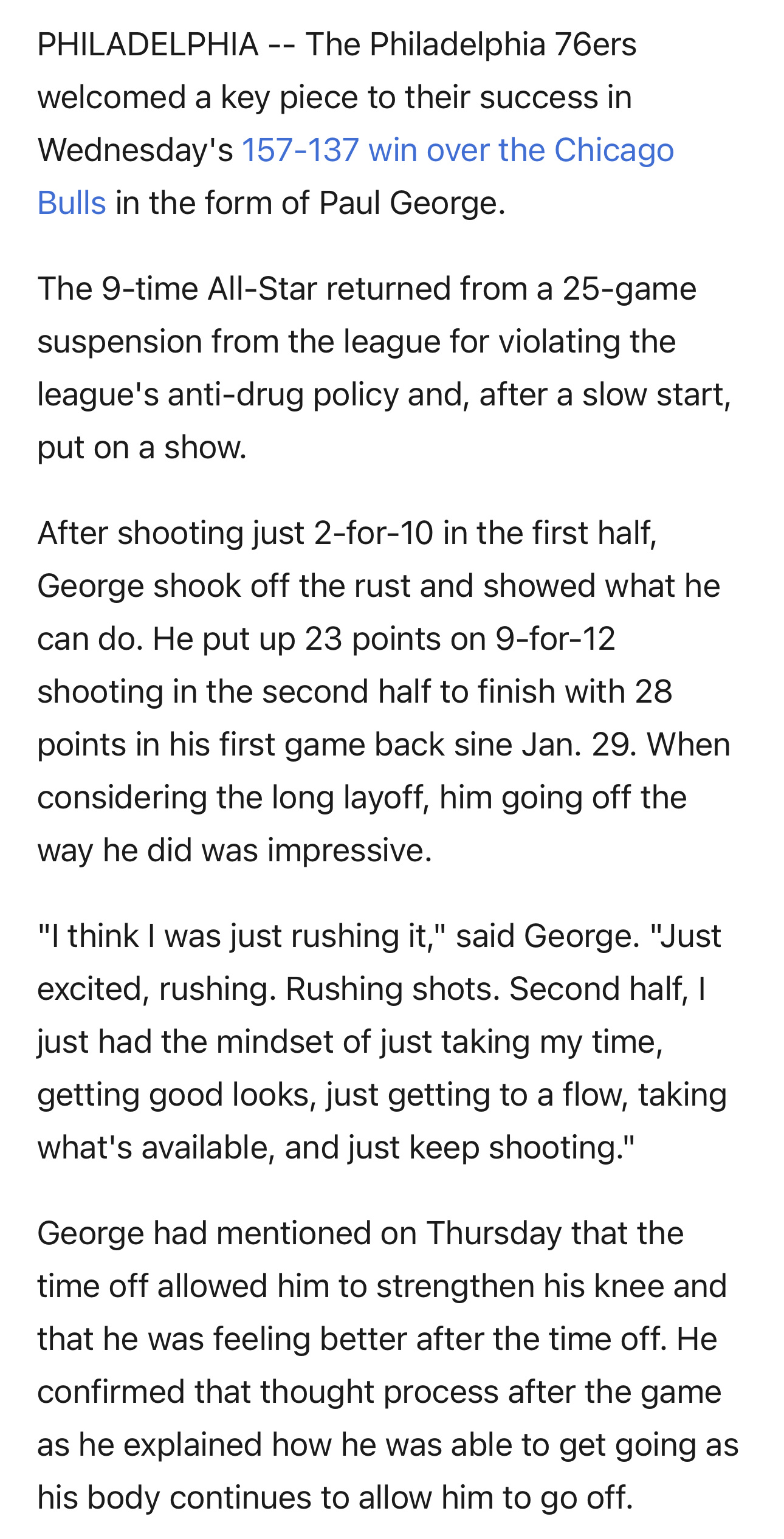 《保罗·乔治解禁复出,76人大胜公牛》