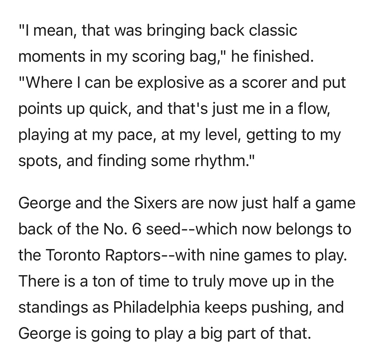 目前乔治领衔的76人队距离东部第6的多伦多猛龙队仅差0.5个胜场,常规赛还剩9场。随着76人队持续发力,他们仍有充足时间提升排名,而乔治将在其中扮演关键角色。