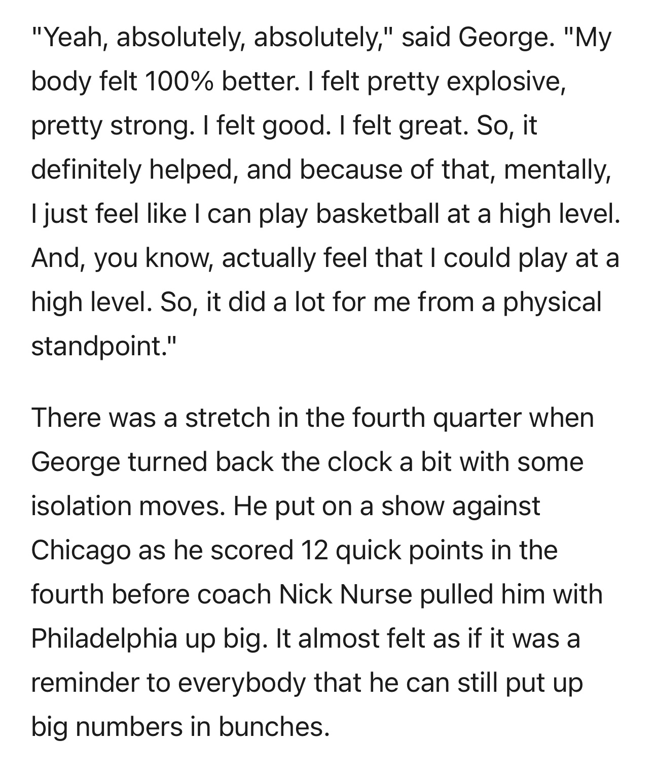 “没错,真的是这样,”乔治说,“我的身体状态恢复到了百分之百。爆发力、身体对抗都很不错,感觉非常棒。这段时间的休整确实帮了大忙,也正因如此,心理上我坚信自己能打出高水平表现,而且实实在在能做到。从身体层面来说,这次休整让我获益良多。”