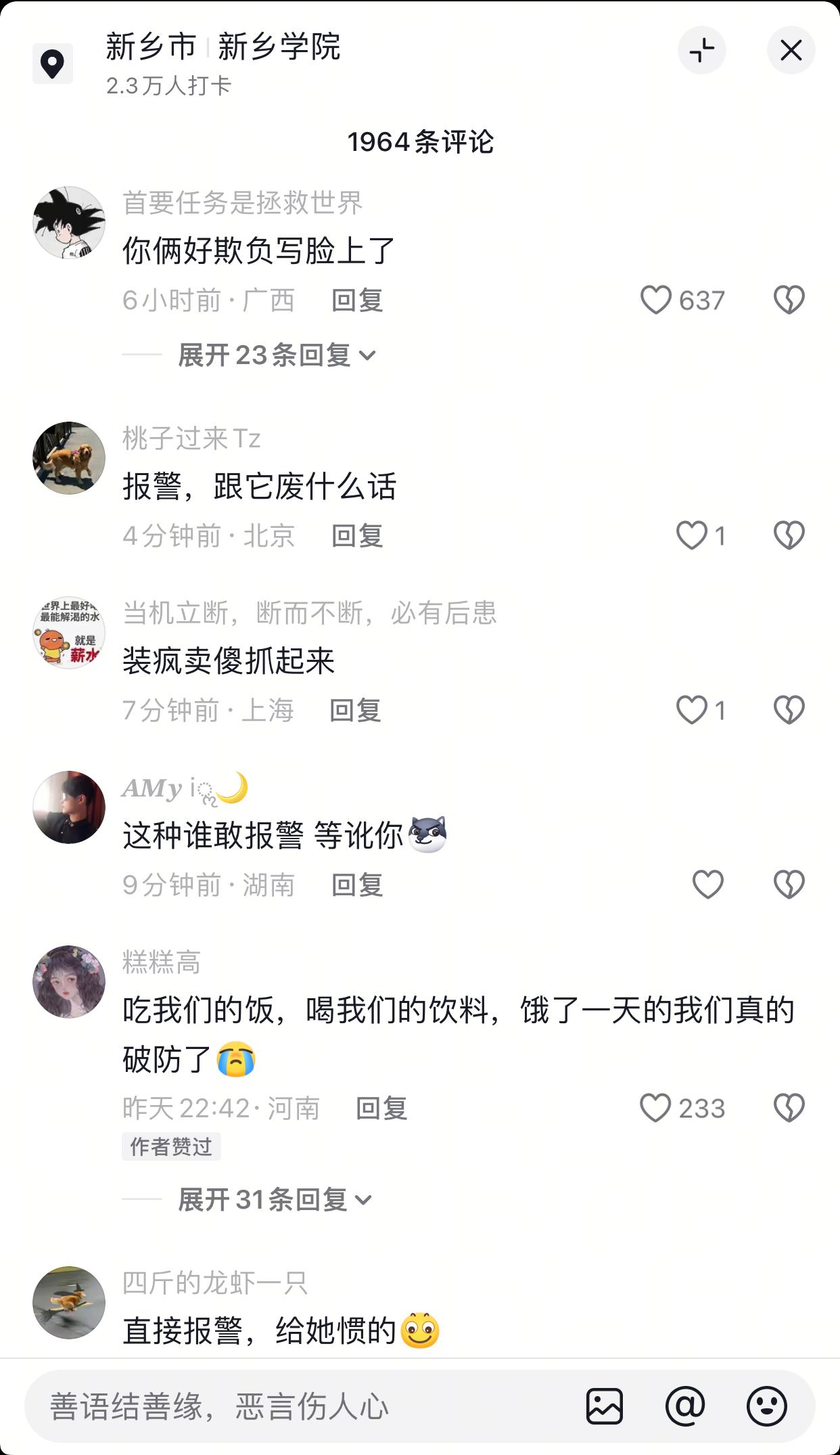 近日河南新乡,两名女大学生点了外卖,骑手送达后不到5分钟她们就下去拿了,结果下去找了半小时都没看到自己外卖的踪影! 最后发现自己的外卖竟然被一位大妈给顺走了,而且还光明正大的坐在门口石墩上吃的津津有味! 两名大学生上去理论,大妈理直气壮的回她们“又不脏,你们也吃呗”! 之后两名大学生问其家人呢?大妈说没家人… 网友们觉得她们太温和了,最后居然还有点同情心泛滥可怜上对方了… 结果评论区有人发大妈坐着电单车被人接走的视频… 只能说这两位小姐姐太善良了~