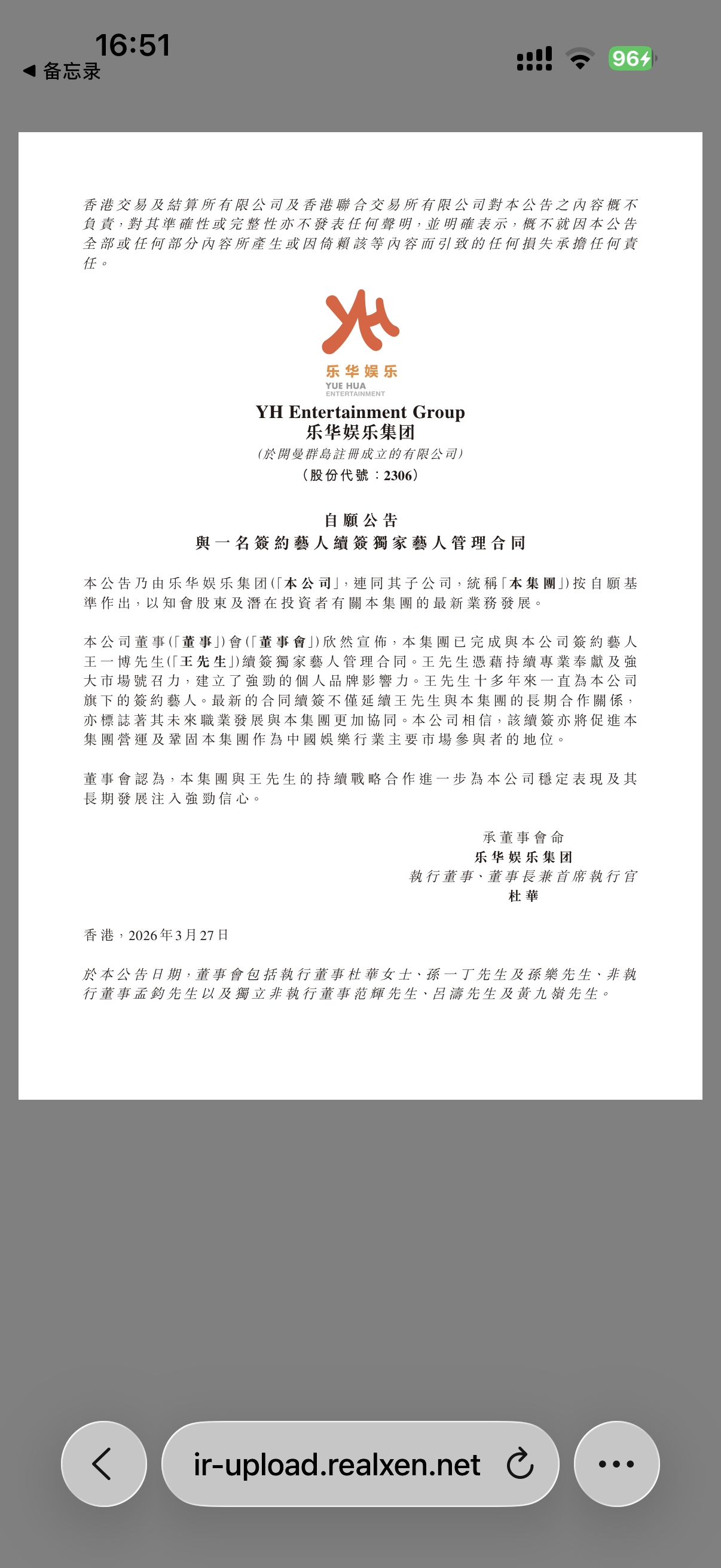 刚刚乐华官网发布通告,本集团已完成与公司签约艺人王一博先生续签独家艺人管理合同,