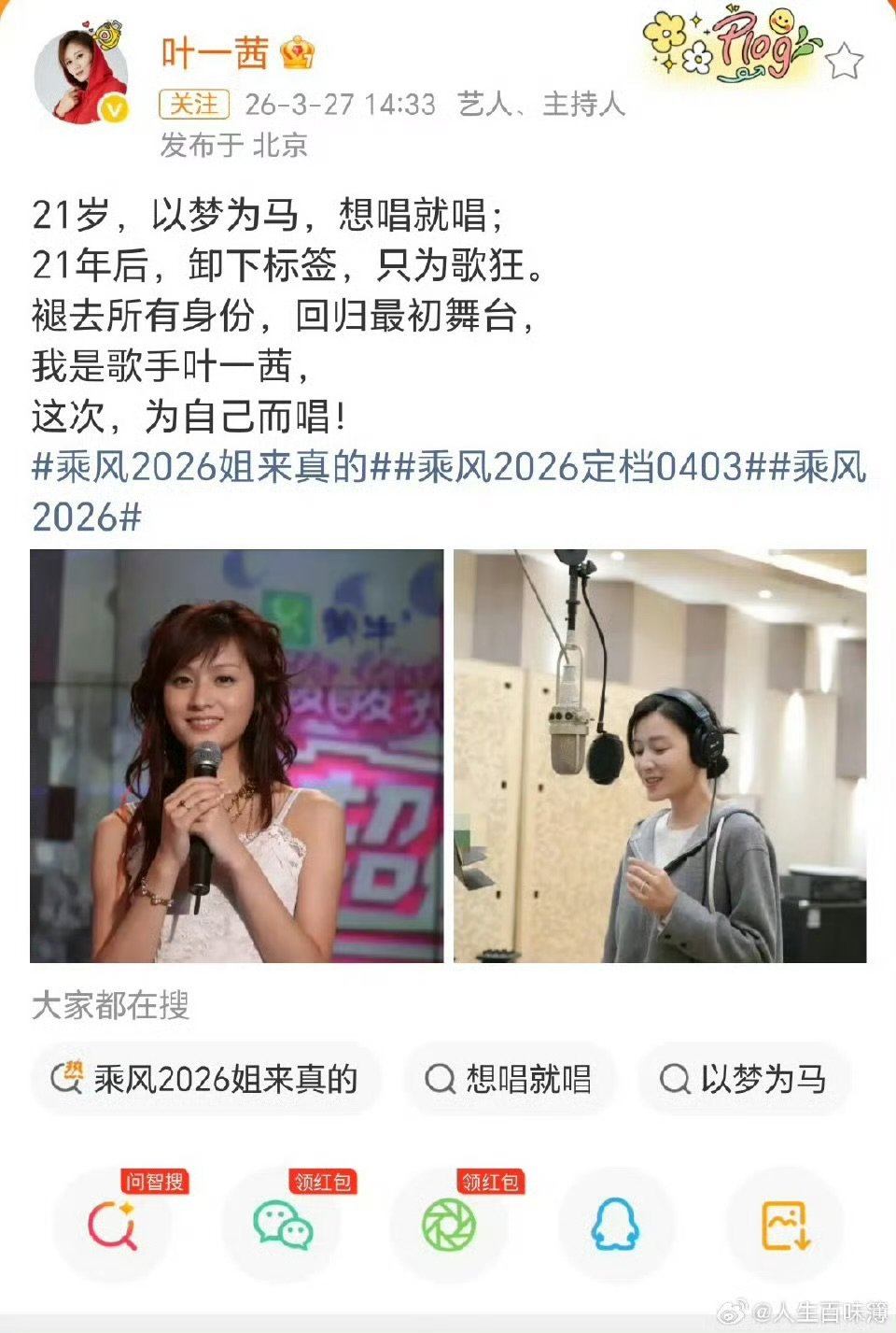 李宇春鼓励叶一茜想唱就唱李宇春给叶一茜打call乘风2026时间就是财富,想唱就