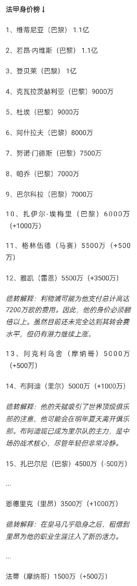 德转更新法甲球员身价:维蒂尼亚、若昂·内维斯仍1.1亿领跑 登贝莱1亿第二 格林伍德涨至5500万 雅凯暴涨至5500万 03月27日 今日德转更新法甲球员身价,维蒂尼亚、若昂·内维斯仍1.1亿欧领跑,登贝莱1亿第2位,格林伍德涨至5500万排第11位,利物浦新援雅凯暴涨3500万至5500万排第12位,恩德里克涨至3500万。巴黎包揽前十名