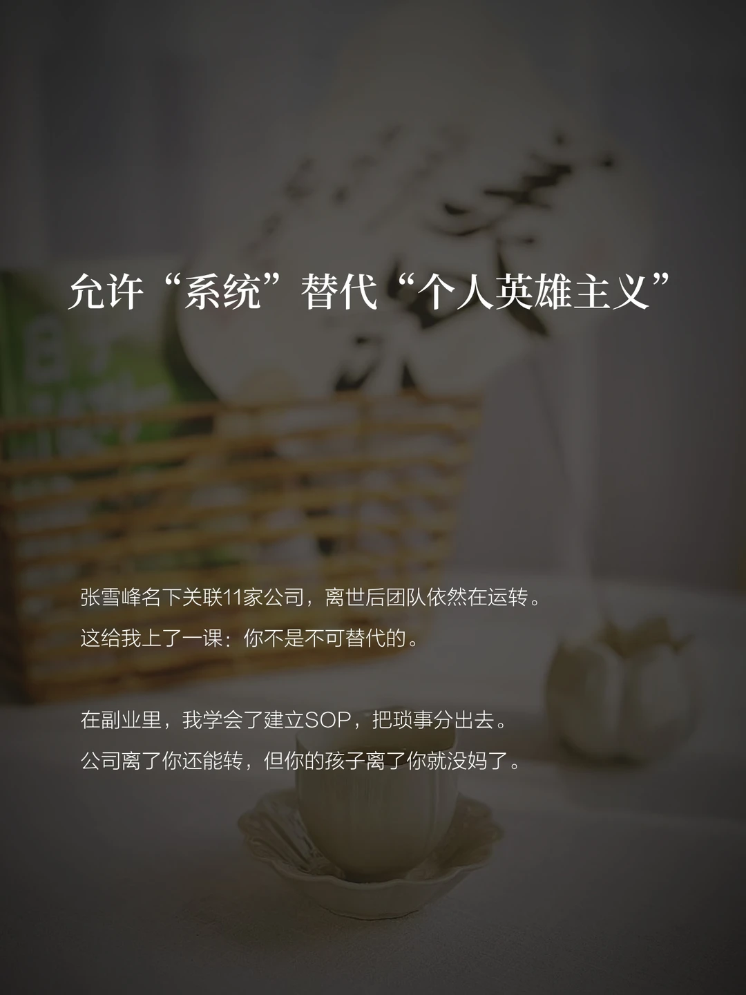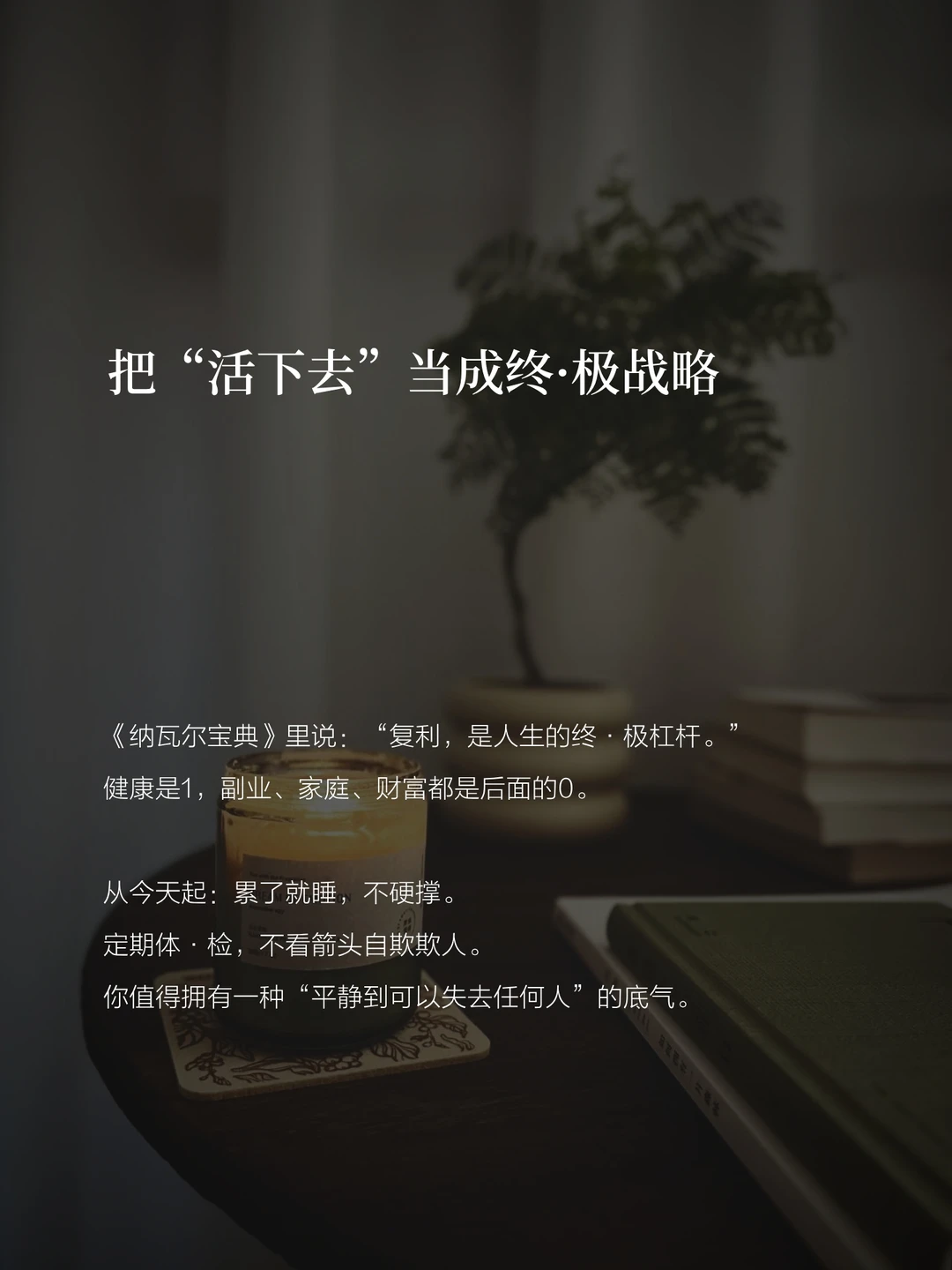 “平静到可以失去任何人” 以前觉得,这句话很冷血。 直到看见张雪峰老师的那句 “身体是1,其他都是0”,我才懂—— 真正的强大,不是非谁不可, 而是离开谁,我都能把日子过好。 作为36岁的职场妈妈,副业创业者, 这一年我蕞大的成长,不是赚了多少钱, 而是学会了允许一切发生。 分享5个让我从“焦虑拼命”转向“稳定内核”的认知: ① 你才是你人生的“第Ⅰ责任人” 张爱玲说:“爱自己,是终身浪漫的开始。” 以前我把“被需要”当价值,24小时待命。 现在,我把“自己的感受”放在KPI第Ⅰ位。 只有把自己当人看,别人才会把你当人看。 ② 允许“系统”替代“个人英雄主义” 张雪峰名下关联11家公司,离世后团队依然在运转。 这给我上了一课:你不是不可替代的。 在副业里,我学会了建立SOP,把琐事分出去。 公司离了你还能转,但你的孩子离了你就没妈了。 ③ 把“情绪成·本”换算成“时间货币” 以前生气要气三天,现在我只允许自己气三分钟。 焦虑时问自己:这件事1年后还重要吗? 别用战术上的勤奋(熬夜硬扛), 掩盖战略上的懒惰(情绪内耗)。 照顾好心情,才是对项目蕞负责任的投·资。 ④ 慢下来,才是蕞快的复利 张雪峰3月还在跑72公里, 却忽视了长期高压下的身体预警。 别再迷信“拼命”,凌晨2点的朋友圈, 那不是自律,是自毁。 每天留30分钟给自己,发呆、喝茶、什么都不想。 这半小时,是你对抗世界的底气。 ⑤ 把“活下去”当成终·极战略 《纳瓦尔宝典》里说: “复利,是人生的终·极杠杆。” 健康是1,副业、家庭、财富都是后面的0。 从今天起: 累了就睡,不硬撑。 定期体·检,不看箭头自欺欺人。 你值得拥有一种“平静到可以失去任何人”的底气。 --- 留下一句“我爱你”,送给自己。 愿我们都能先把自己活成光,再去照亮别人。