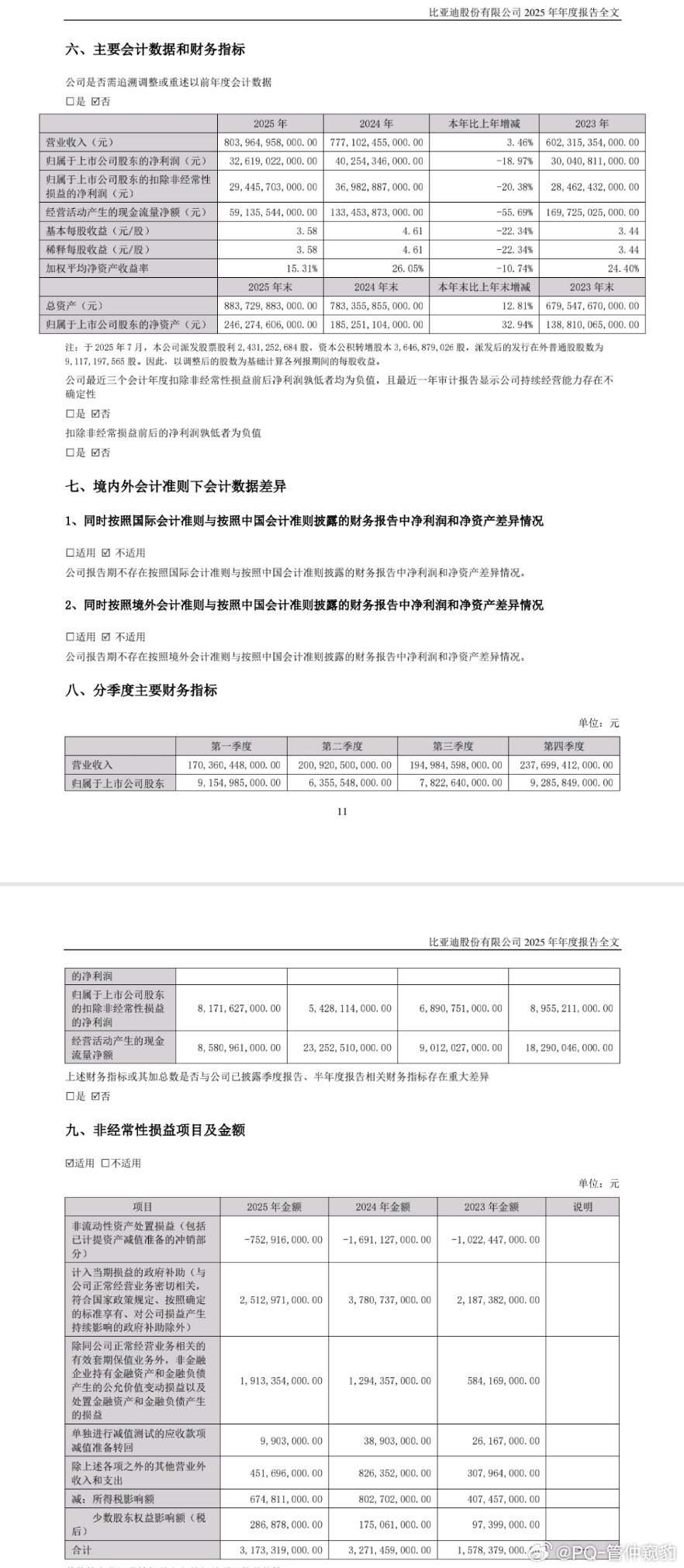 2025比亚迪财报来了营收8039.6亿,同比增长3.46%全年净利润326.2亿元,同比下降19%汽车、汽车相关产品及其他产品业务的收入约人民币6486.46亿,同比增长5.06%手机部件、组装及其他产品业务的收入约人民币1552.37亿,同比减少2.74%