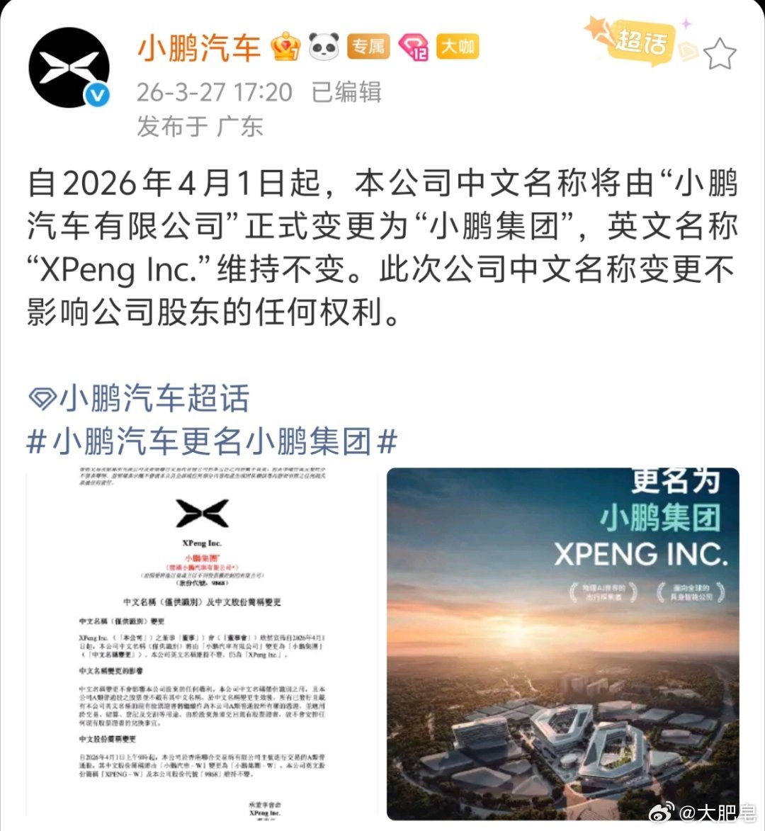 小鹏汽车更名小鹏集团早就想到会有这么一天,小鹏上次我记得就说过,自己不是汽车公司,而是一个科技公司。汽车、低空飞行、机器人、AI、芯片、智能辅助驾驶……你想想,哪个汽车公司能干这么多事儿?这是科技公司干的事儿。 小鹏汽车已更名小鹏集团