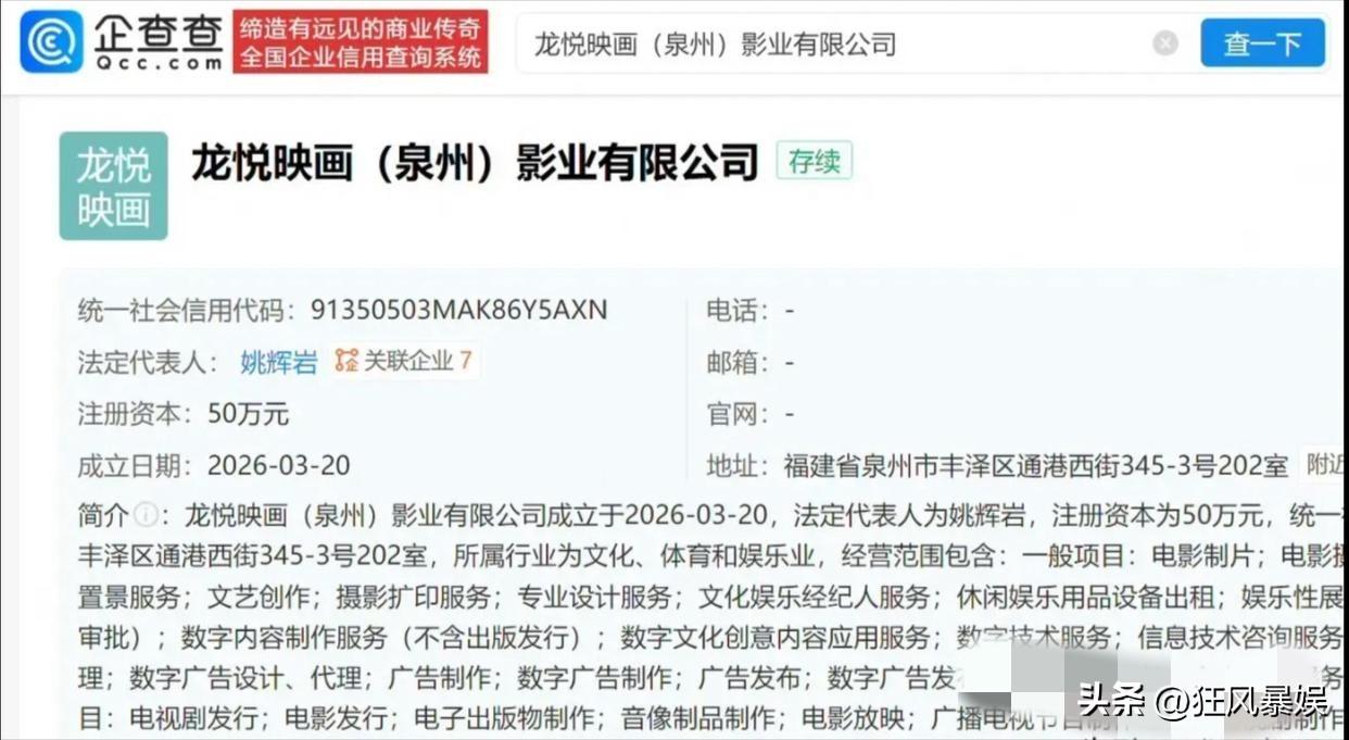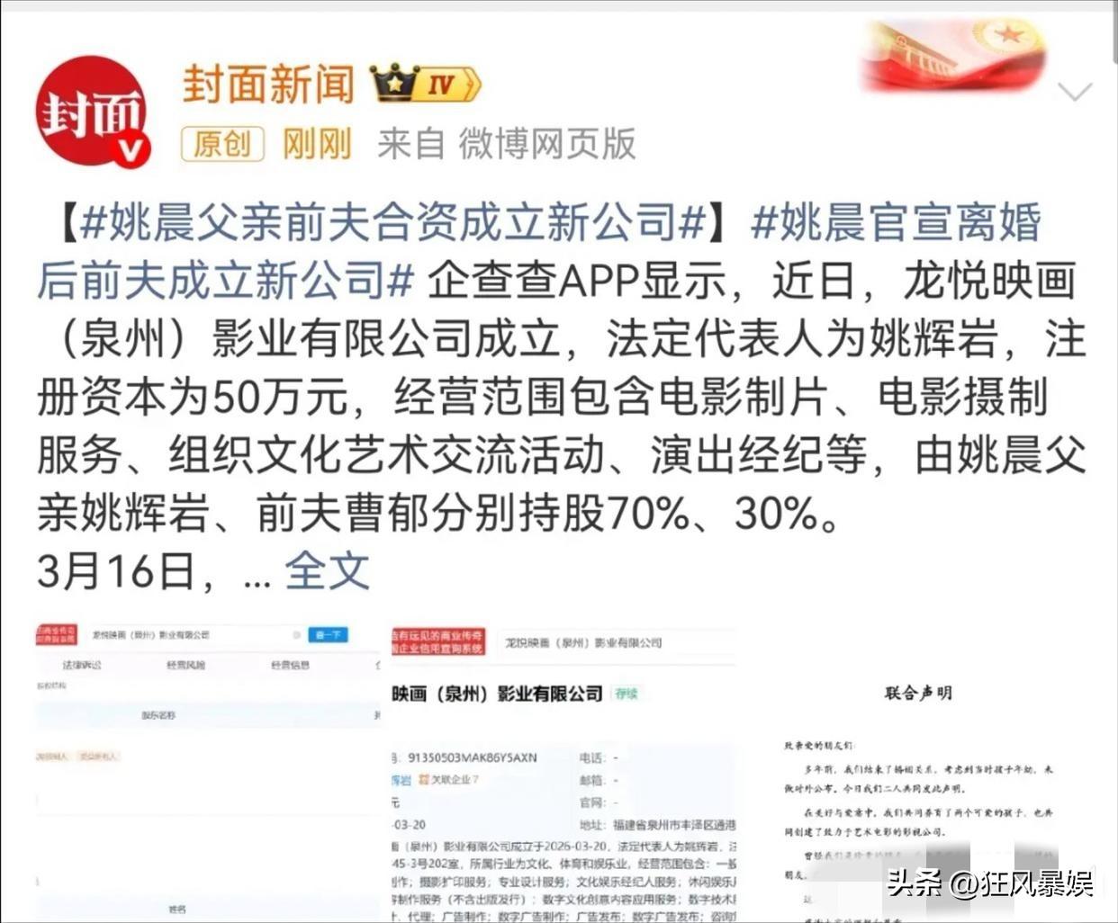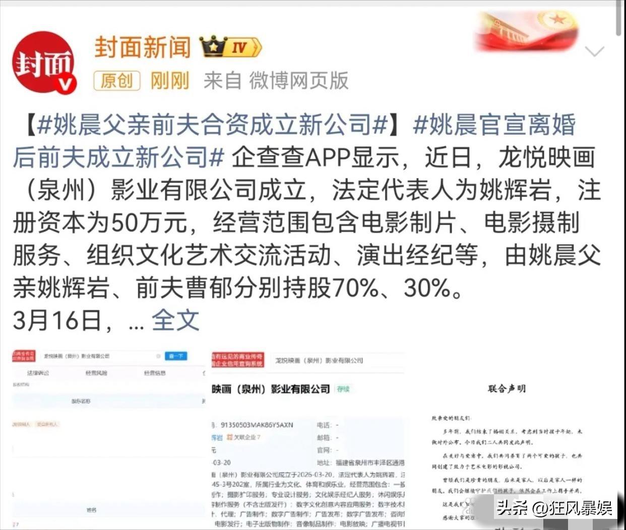 姚晨与前夫,冲上热搜! 3月27日,姚晨和前夫曹郁双双冲上热搜。距离两人官宣离婚仅仅过去21天,这对昔日夫妻竟然还有新合作,让不少网友直呼“意外”。 根据企查查显示,近日一家名为龙悦映画(泉州)影业有限公司正式成立。让人意想不到的是,公司的法定代表人竟然是姚晨的父亲姚辉岩,注册资本50万元,业务涵盖电影制片、摄制、演出经纪、文化艺术交流活动组织等。股权结构上,姚父持股70%,曹郁持股30%。 就在3月6日,姚晨和曹郁刚刚发布联合声明,官宣多年前就已结束婚姻关系。声明中,两人表示会共同抚养孩子,彼此祝福,言辞体面平和。当时就有网友感叹,这大概是娱乐圈最体面的离婚之一。 没想到,离婚才21天,前夫就和前岳父联手开起了影业公司。这一操作再次刷新了大家对“体面离婚”的认知——不仅是共同抚养孩子,连事业上的合作都能继续,而且还是与前岳父搭档。 有网友评论:“这才是真正的分开不分情,成年人的体面和默契,姚晨和曹郁演绎到了极致。”也有人调侃:“别人离婚是分家产,他们离婚是合伙开公司,格局打开了。” 当然,也有网友好奇:离婚后还能与前岳父合伙做生意,这得是多好的关系?无论如何,能在婚姻结束后依然保持如此理性的合作关系,确实不是一件容易的事。姚晨和曹郁用行动证明,离婚不是终点,也可以是另一种关系的起点。