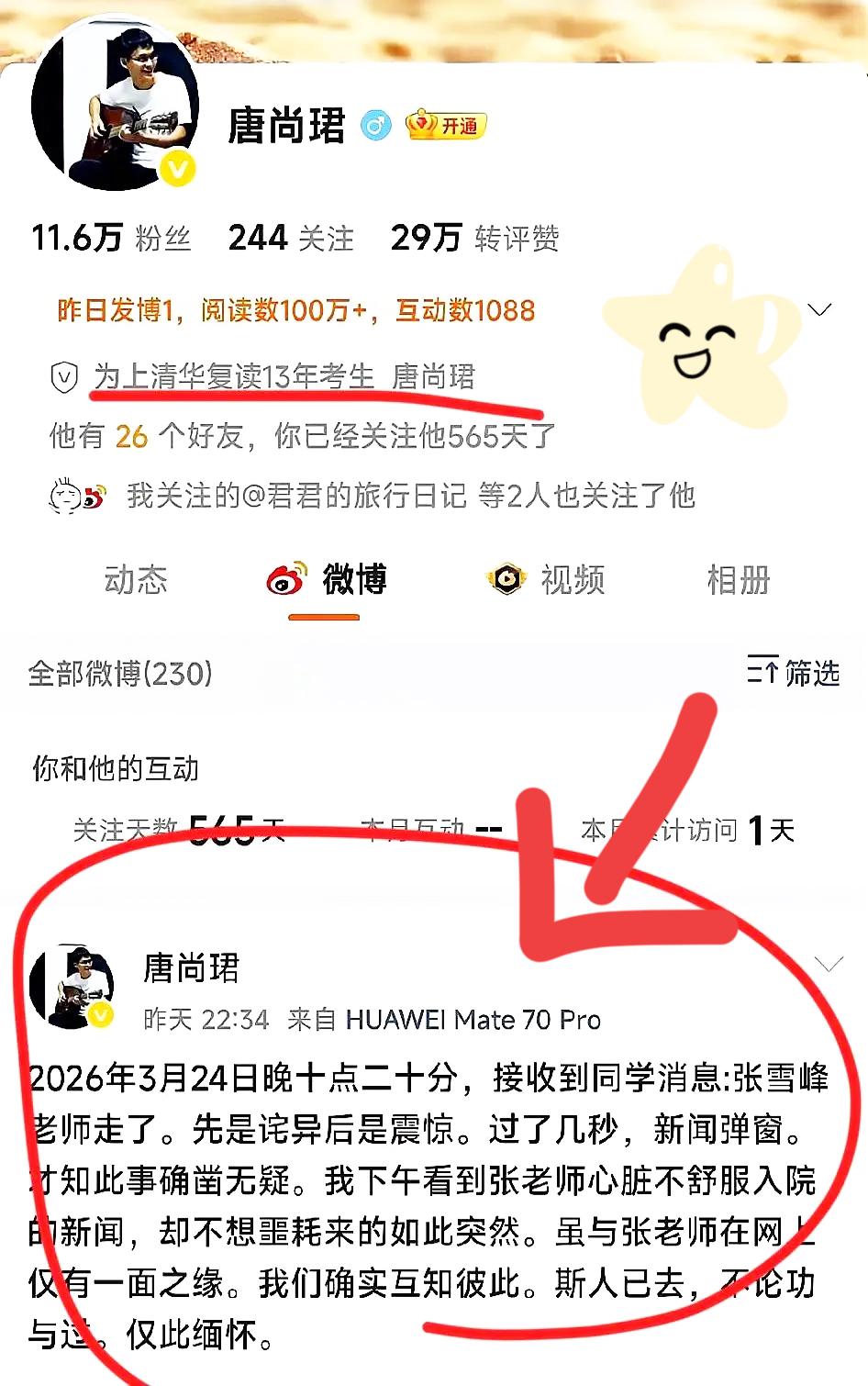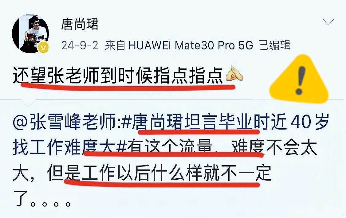 看哭了!高考钉子户唐尚珺悼念张雪峰,一句望您指点,竟成永无回应的遗憾! 唐尚珺和张雪峰,只在网上聊过一次,张雪峰看他年近四十仍执着求学,劝他去考研,唐尚珺回了简简单单四个字:望您指点。他本以为这是人生规划的开始,却没想到,那个总在屏幕前语速飞快为无数人指引方向的人,竟在41岁戛然而止,再也给不了后续的答案。 如今再点开对话框,那句请教还停在那里,下面却是永远的空白。这世间最无奈的,莫过于满心期待的开头,没有了本该有的后续。一个拼尽全力想拿到踏入社会的门票,一个掏心掏肺为别人勾画前路,可命运偏不讲道理,谁都没能按预想的轨迹走完人生。 我们总以为来日方长,却忘了世事无常,很多话没说,很多事没做,就成了一辈子的遗憾。 你有没有过一句没说出口的话,或是一个没能完成的约定,成了心底的遗憾?