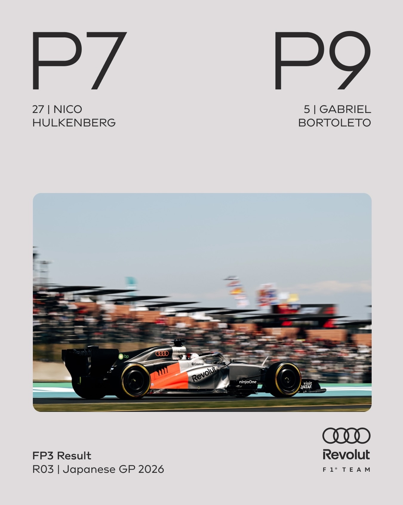 2026赛季F1日本🇯🇵大奖赛 FP3结束🔚梅赛德斯车队车手安东内利以1:29.362排在第一、队友拉塞尔排在第二,法拉利车队车手勒克莱尔第三、队友汉密尔顿第五,迈凯伦车队车手皮亚斯特里第四、队友诺里斯第六,奥迪车队车手霍肯伯格第七、队友博托莱托第九,红牛车队车手维斯塔潘第八……
