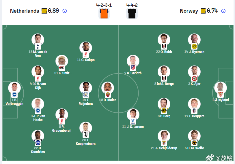 荷兰2比1挪威 当范海克、范戴克、范德文一字排开,再加上邓弗里斯,这条荷兰防线看起来很强,身前还有一个后腰格拉芬贝赫。但挪威队缺少了哈兰德,没有真正检验这个后防体系的硬度。本菲卡前锋施耶德鲁普接到沃尔夫助攻,率先破门。