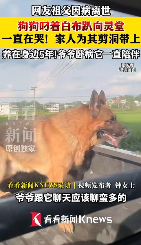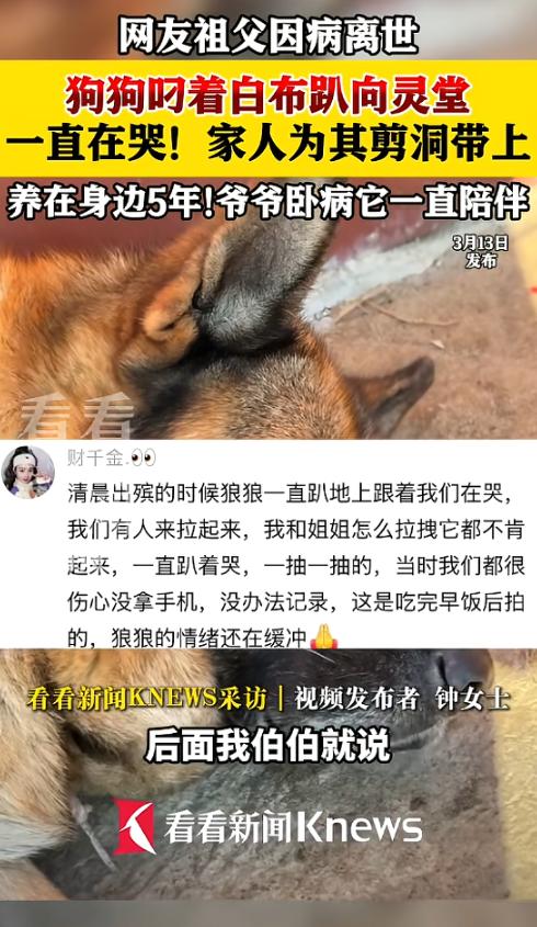 “太有灵性了!”近日, 江西赣州,一老人家中养了条小狗,平日感情深厚,老人去世后,小狗嘴里叼着白布,对着遗照的位置趴着不肯起来,众人看到后,十分揪心,想着小狗肯定舍不得老人,就把白布剪了两个洞,给小狗戴上!网友:其实小狗什么都知道! 有一只格外忠诚的小狗,名叫狼狼,它在四岁那年,偶然走进了一位老人的生活。 从狼狼踏入老人家门的那一刻起,一人一狗便渐渐绑定了彼此的时光。 老人起床第一件事,总会先给狼狼倒上温热的清水和足量的狗粮,看着它安安静静地吃完,自己才去洗漱、准备简单的早餐。 小小的餐桌上,老人吃着清淡的粥和小菜,狼狼则在一旁的地上啃着狗粮。 若是天气晴朗,老人会搬一把椅子坐在院子里晒太阳,狼狼便会乖乖蜷在老人的脚边,脑袋轻轻枕着老人的裤腿,眯着眼睛打盹,模样温顺又黏人。 老人没事的时候,总爱对着狼狼絮絮叨叨说些心里话,说说自己年轻时的过往,讲讲儿女小时候的趣事。 不管老人说的是开心还是难过的事,狼狼虽然听不懂,但还是会用圆溜溜的眼睛望着老人,尾巴时不时轻轻晃动。 后来老人中风,身体瞬间垮了下来——行动变得迟缓笨拙,说话也含糊不清,大多数时候只能躺在床上,偶尔才能在家人的搀扶下坐在轮椅上。 儿女们得知消息后,第一时间就回家照顾老人。 与此同时,狼狼也始终寸步不离守在老人身边的。 从老人中风的那天起,狼狼仿佛察觉到了老人的不适,再也不像以前那样到处乱跑、调皮捣蛋,而是安安静静地守在老人的床边或是轮椅旁,一刻也不肯离开。 哪怕自己饿了、渴了,也只是匆匆跑到食盆边吃两口、喝两口,便立刻飞奔回老人身边。 狼狼就这样陪着老人,度过了一个又一个日夜,而老人也因为有狼狼的陪伴,每天的生活并不孤单。 可岁月终究不饶人,老人的身体状况越来越差,终究还是没能挺过去,不幸离开了人世。 老人离世的那天,家里来了很多亲戚朋友,大家忙着布置灵堂、祭奠老人,屋子里到处都弥漫着悲伤的气息,哭声和叹息声此起彼伏。 狼狼看着家里突然涌来这么多陌生人,看着每个人脸上都挂着悲伤的神情,看着灵堂中央摆放着的老人遗照和骨灰盒,仿佛明白了什么。 它没有像往常那样凑到家人们身边撒娇,也没有发出任何吵闹的声响。 狼狼只是在屋子里转了一圈,然后用嘴叼起灵堂旁边一块用来祭奠的白布,慢慢走到遗照和骨灰盒面前,轻轻趴了下来,眼睛一动不动地盯着老人的遗照。 在场的人们无意间瞥见趴在那里的狼狼,所有人都不由自主地停下了动作,心里一下子就被揪紧了。 狼狼是舍不得老人,它在用自己的方式,送别这位朝夕相伴的主人,诉说着心底的思念与不舍。 老人的家人忍不住蹲下身,轻轻摸摸狼狼的脑袋。 可狼狼只是微微抬起头,看了一眼来人,便又缓缓低下头,依旧紧紧咬着那块白布,趴在原地不肯挪动分毫。 后来,家人找来了剪刀,在它咬着的白布上剪了两个洞,随后温柔地将这块白布套在了狼狼的头上。 转眼就到了老人出殡的日子,亲戚朋友们忙着抬棺、送葬,屋子里的悲伤气氛达到了顶点。 狼狼依旧戴着那块白布,安安静静地趴在灵堂里,看着人们忙碌的身影,它突然发出了低沉的呜咽声。 家人们想把狼狼拉起来,可不管她们怎么温柔地拉拽,狼狼都不肯起身,只是死死趴在地上,身体一抽一抽的,哭了起来。 有的人拍下了狼狼的模样,发到了网上,而这段视频引来无数网友的热议。 有网友留言说道:“看一次哭一次,这只小狗也太忠诚了,朝夕相处的感情,早就刻进了它的骨子里。” 还有网友感慨道:“它明明不会说话,却把对老人的思念和不舍,全都写在了眼神里、刻在了动作上。” (信息来源:看看新闻Knewsv《网友祖父因病离世 狗狗叼着白布趴向灵堂 养在身边5年爷爷卧病他一直陪伴》)