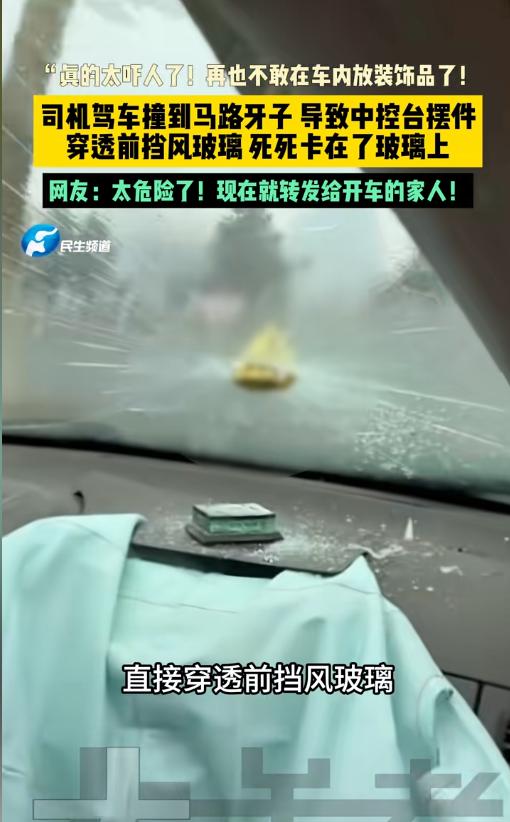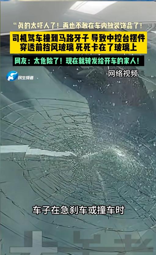 “太吓人了!”近日,山东,一位司机在转弯时,不小心撞上了马路牙子,结果中控台上的摆件飞了出去,直接穿透了前挡风玻璃,像钉子一样深深嵌了进去。这一幕可把司机给吓坏了,暗自庆幸没有飞向自己。网友:说多少次了车上不要放这些东西! 不少人都喜欢在车上挂些装饰品,或者是在中控台放些摆件,一来起一些装饰作用,二来也想着祈福。其实,这是一种错误的行为,不仅遮挡了行车视线,出事故时,还可能变成隐形的杀手。 据媒体3月26日报道,该车主就遇到了这么个问题,差点把小命儿给丢了。他在开车转弯的时候,出了意外,车直接撞上了马路牙子。虽然人没事,可当他查看时,魂儿都要被吓到了。 自己在车上中控台放了个摆件,撞击的瞬间就飞了出去。摆件是一个下宽上窄的构造,顶上有点尖。它砸在了前挡风玻璃上,直接就给扎透了,也就是尾比较大才没整个都穿出去。 车主看完止不住的后怕,万一当时撞击的方向有些变化,搞不齐就冲自己飞过来了,要是这样,自己怕是要当场交代了。司机直呼,以后再也不敢放东西了。 其实,这真不是危言耸听,背后有着科学知识。在车辆发生撞击或者急刹车时,在冲击力的作用下,里面的摆件会直接飞起来。看似轻飘飘的东西,在速度的加持下也会产生巨大的冲击力,足以对人体造成严重的伤害!所以,车里面不要再放这些东西了,让车子轻装上阵,也让自己安全上阵! 信息来源:《“真的太吓人了!再也不敢在车内放装饰品了!司机驾车撞到马路牙子 导致中控台摆件穿透前挡风玻璃 死死卡在了玻璃上 网友:太危险了!现在就转发给开车的家人!》大参考
