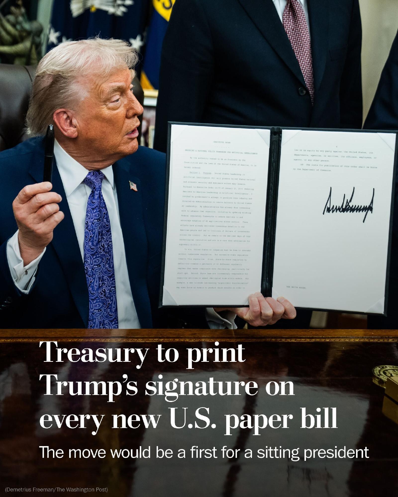 美国财政部计划在所有新版纸币上印上特朗普总统的签名。此举恰逢一项正在进行的努力,即把他的肖像印在硬币上,这引发了批评,因为联邦法律禁止在美国货币上描绘在世总统的肖像。