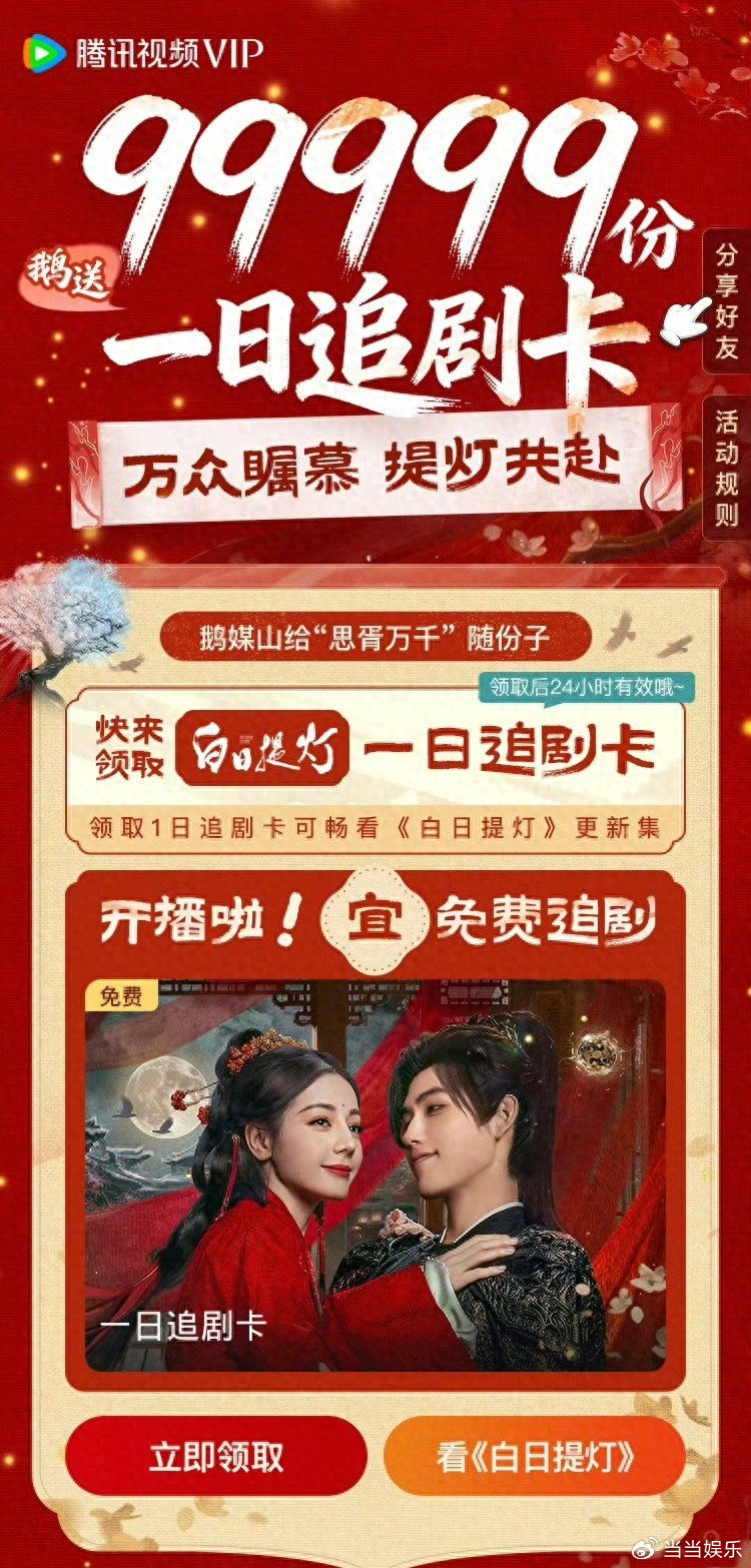 开局就甩王炸,鹅厂这回是真豪横今天中午12点,腾讯视频这波操作直接把剧迷们砸懵了。为了给新剧《白日提灯》营造声势,平台一下子拿出99999份一日追剧卡,重点突出“免费看个痛快” 句式,进行宣传。