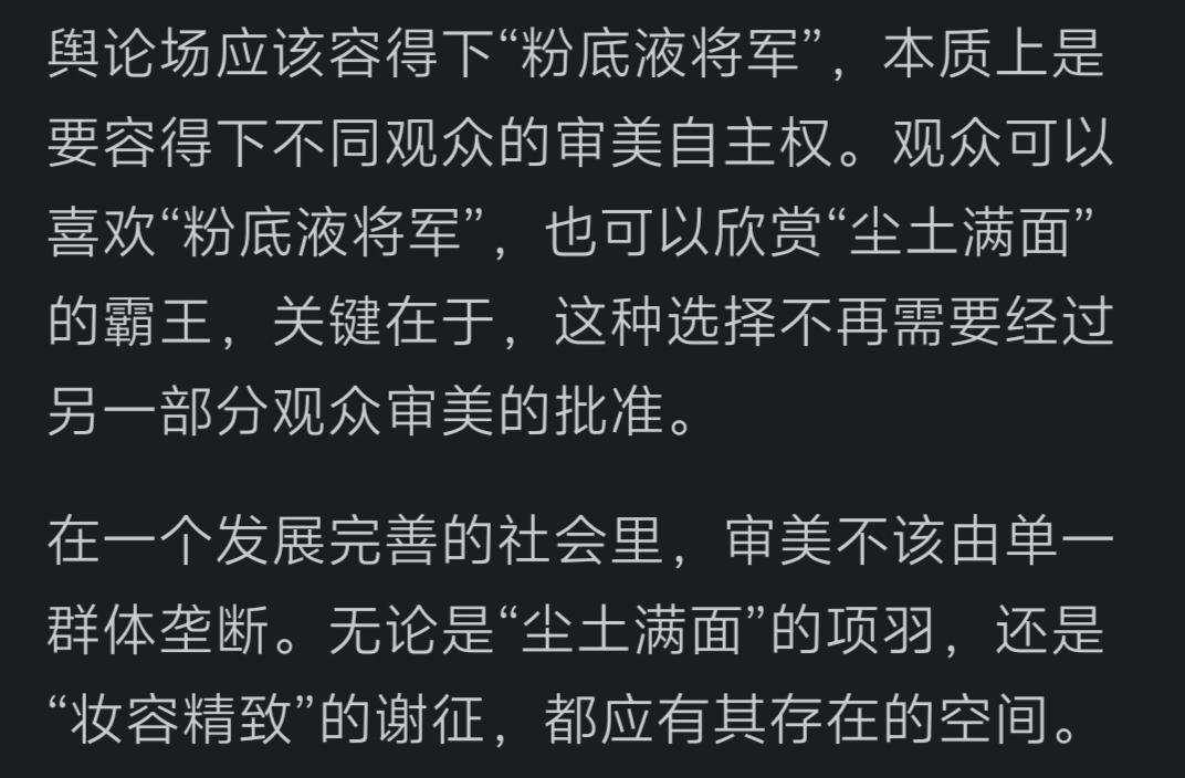 军媒严肃批评“粉底液将军”,观察者网却唱反调,称舆论场应该容得下他。从“贞洁观”