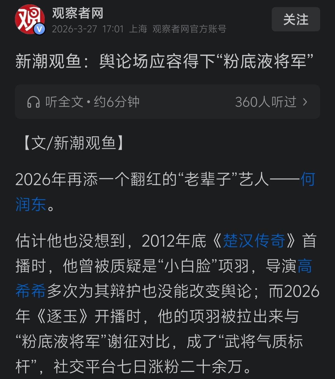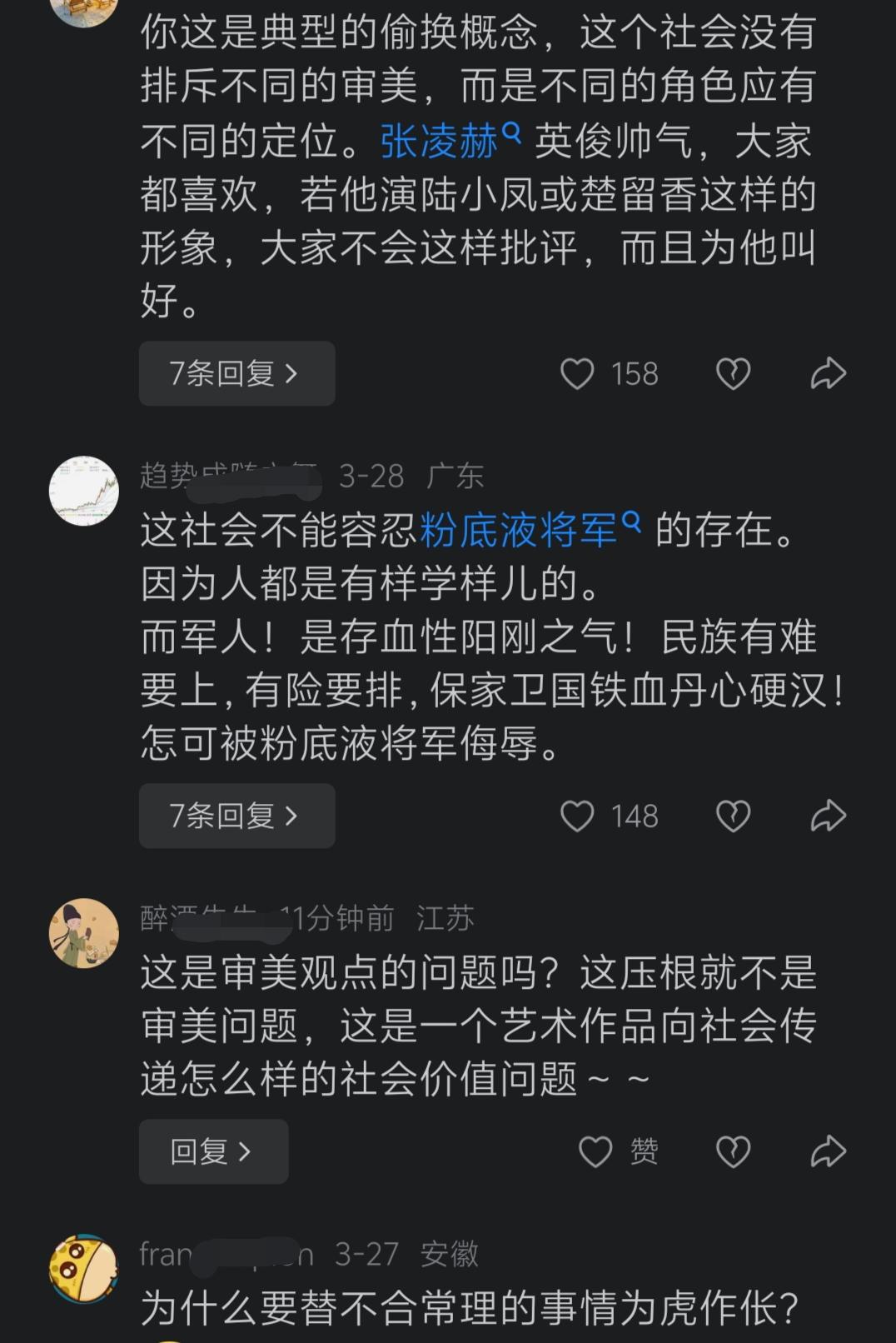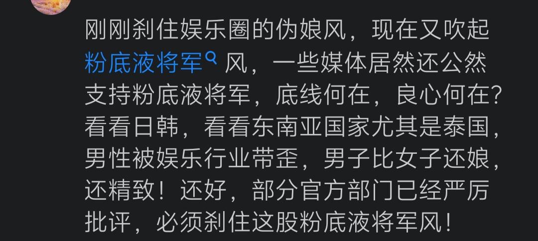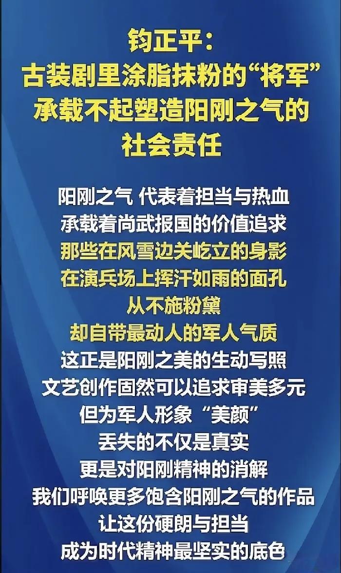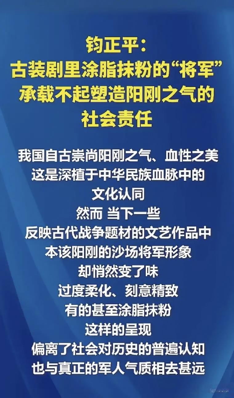军媒严肃批评“粉底液将军”,观察者网却唱反调,称舆论场应该容得下他。从“贞洁观”开始,这是打算不装了?要摆明对着干了? 近日,军媒“钧正平”、“钧正平工作室”对某古装剧中出现涂脂抹粉的将军一事,发“钧平”表示:“我国自古崇尚阳刚之气、血性之美,这是深植于中华民族血脉中的认同。古装剧里涂脂抹粉的‘将军’,承载不起塑造阳刚之气的社会责任。” 文章发出后,得到众多网友点赞的同时,竟然遭到某张姓演员粉丝的“开冲”。 随后,在网友的指点下,这些粉丝了解了“钧正平”的真实身份后,火速删除了各自的评论,而那位张姓演员所饰演的将军,也被戏称为“粉底液将军”。 “钧正平”严肃批评“粉底液将军”一事,虽然得到了大家的一致点赞,但是却也有媒体跳出来唱反调了! 就在大家批评“粉底液将军”,反对“去雄化”的时候,观察者网却发布了一篇名为《新潮观鱼:舆论场应容得下“粉底液将军”》的文章。 该文章洋洋洒洒一大片,各种举例、各种对比,其目的就是为了证明应该认同“粉底液将军”的存在。 在该文末如此写着“舆论场应该容得下‘粉底液将军’,本质上是要容得下不同观众的自主审美权”、“在一个发展完善的社会里,审美不该有单一群体垄断”。 这样的结尾,这样的观点,又是在明着和大家唱反调呀。 特别是那一句“审美不该有单一群体垄断”,更是似乎意有所指、心怀不正! 至于这篇文章,又和一些媒体批评“贞洁观”的文章一样,下面的评论量远超点赞量。 这众多的评论,大都是对文中的内容及观点持反对态度。甚至有网友指出,这是典型的偷换概念! 这段时间,一些媒体不知道怎么了,只要是大家赞同的,他们总是想着法子去反对,甚至不惜去曲解、误导大家。 这种接连发生的现象,是不是预示着他们已经打算不装了,打算要和大家对着干了?