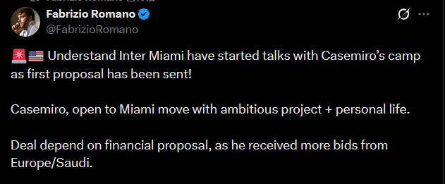 罗马诺🇺🇸据了解,迈阿密国际已经与卡塞米罗的团队展开谈判,并已发出第一份报价