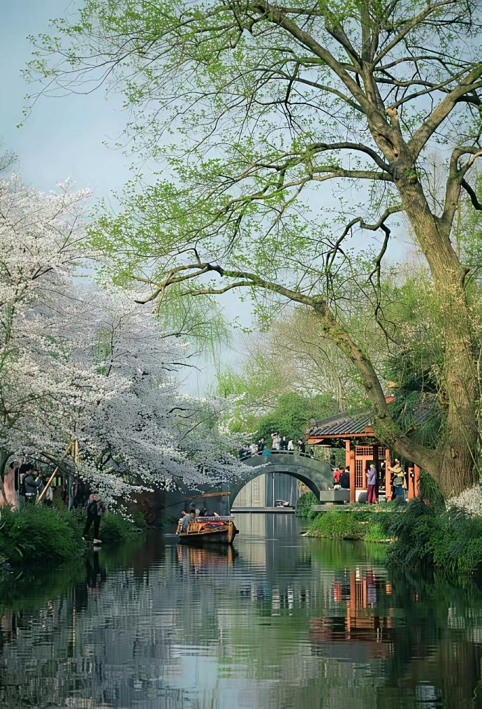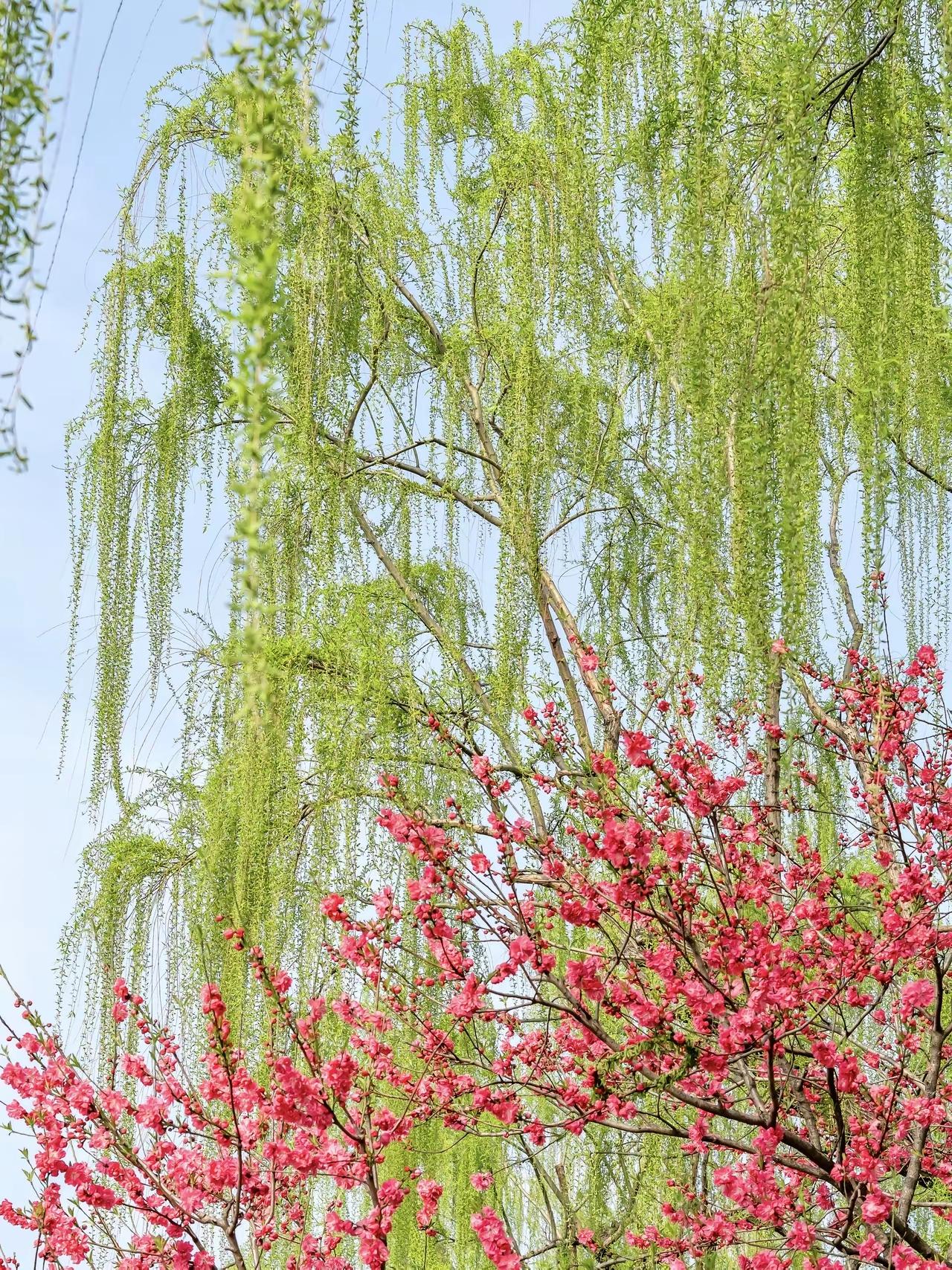 杭州的春天,藏在西湖十大景色之一的曲院风荷里。临水而开的樱花,红白相间的桃花一起