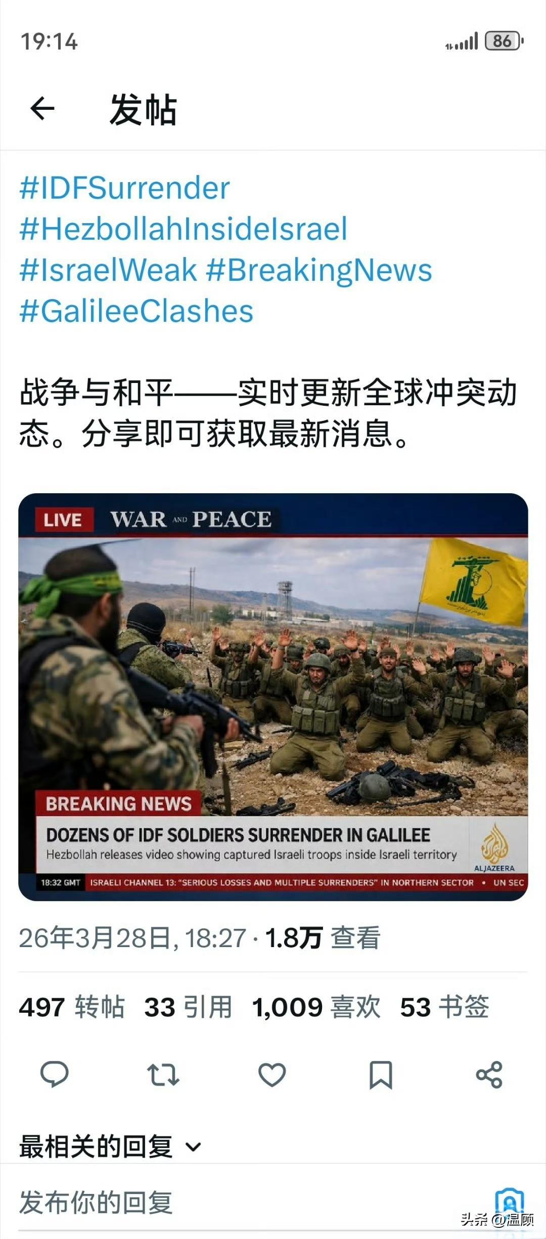 真主党刚刚发布视频,数十名以色列国防军士兵在加利利梅图拉附近投降,在以境内向真主党战士举手放下武器,画面已全网传播。 以色列第13频道证实:北部战区伤亡惨重,多部投降。这被视为以军近年最屈辱的战场事件之一。 此前真主党已在北线重创以军装甲部队,多辆梅卡瓦坦克被摧毁;如今再出现成建制投降,以军北部防线与军心压力空前。