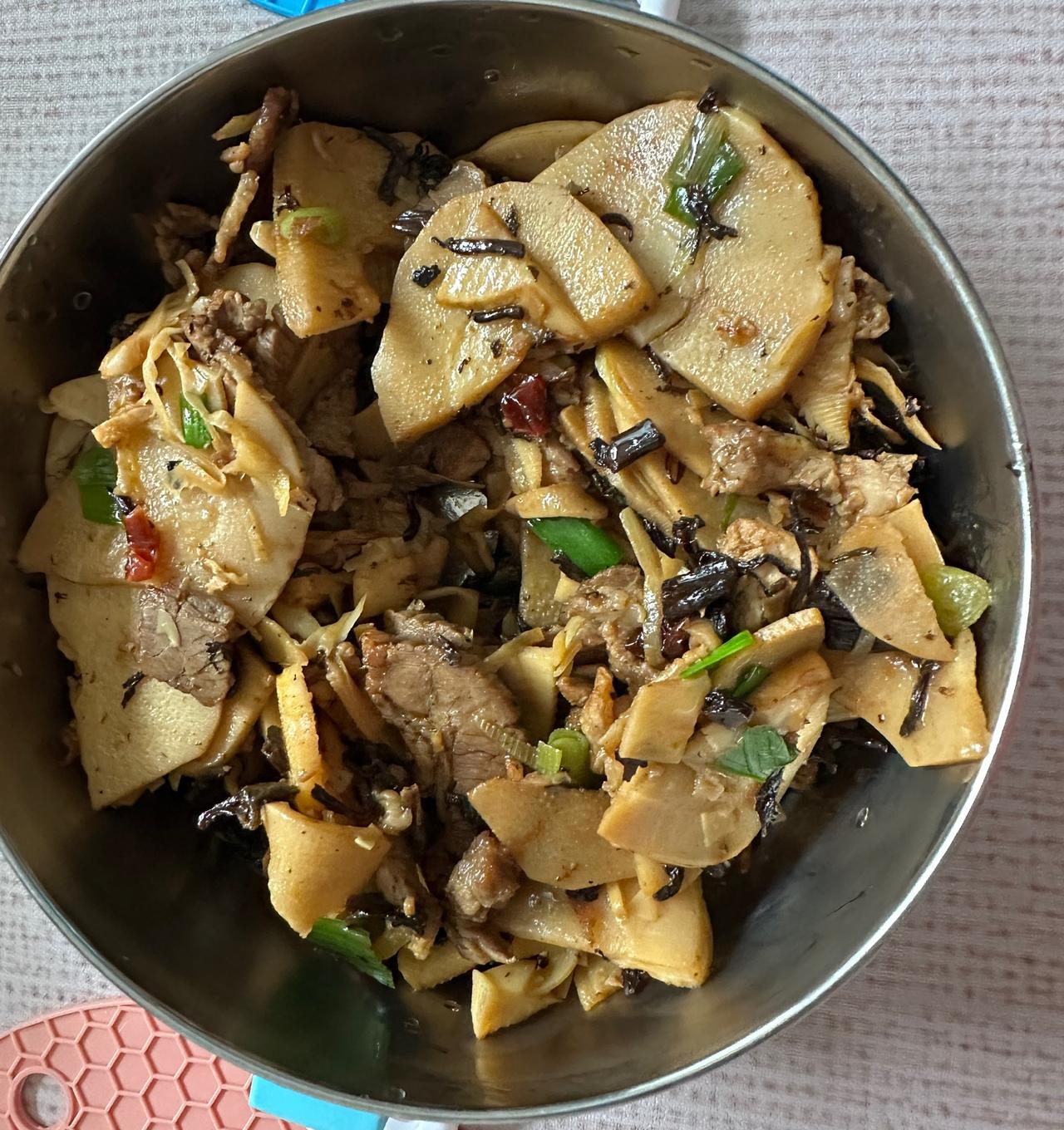 父亲说给他买点冬笋,到了农贸市场一看,没有冬笋,春笋已经上市了,市场上售卖的春笋都是还没有从泥土里冒出来就被采挖的,看起来都很嫩,买了几个笋芽儿回来。 这个月服侍母亲事情比较多,三月份都快过去了,都没有给每天生活自理自己做饭的老父亲放一天假歇一歇,昨日就跟父亲说,让他今天不用做菜用电饭煲煮点饭就行,我会在家里烧好了菜带过去。 今天早上8:00起床吃了早饭后就开始给父母做菜了: 排骨煮芋头一锅,把排骨先煮一个半小时,再放入芋头,都煮得很烂,母亲吃的那一份还特意把肉切碎了。 春笋炒猪肉一盘、放了点咸菜一起炒,免得笋片涩嘴。 豆腐干炒马兰头一盘,豆腐干很软,马兰头助消化。 做好之后用保温桶装好送到父母家,11:30,赶上了父母吃午饭的时间,二老都说这菜很好吃。 上午的时间全部给了父母,值了!