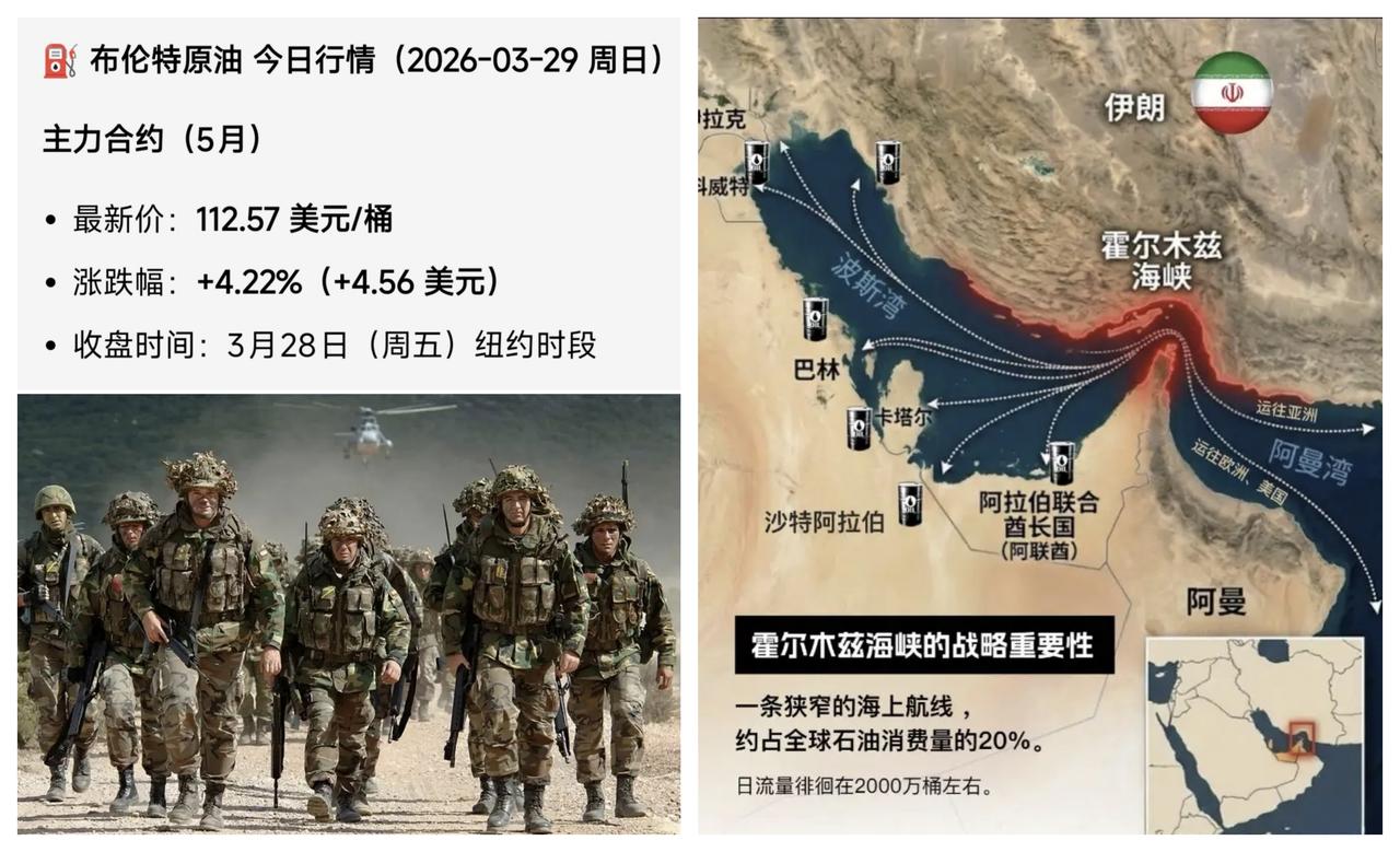 ✨布油价112美元,地面战一触即发✨ 🐼 世界上没有人能够明白,美国为什么要调动1万来人,就敢跟伊朗进行地面作战。但是,布伦特原油期货价格已经表明,地面战已经迫在眉睫了。美军将会付出巨大人员伤亡的代价。 🐼 战前各种假消息满天飞,以色列防长说以色列兵源不足,万斯说美军准备撤退,这都是在忽悠伊朗的,肯定还是准备要搞偷袭。但是,伊朗不只有导弹和无人机。 🐼 伊朗还有1500辆坦克,6000余门火炮,其中1500门火箭炮。难道美国研发出来了高端秘密武器吗?才这么有信心发动地面战? 贫道个人十分想看一看,这场仗到底会打成什么样子。 —— 美军地面战若是输了,在中东地区就彻底呆不住了,只能提桶跑路了。以色列以后就好自为之吧。 作者:龙须面🧐