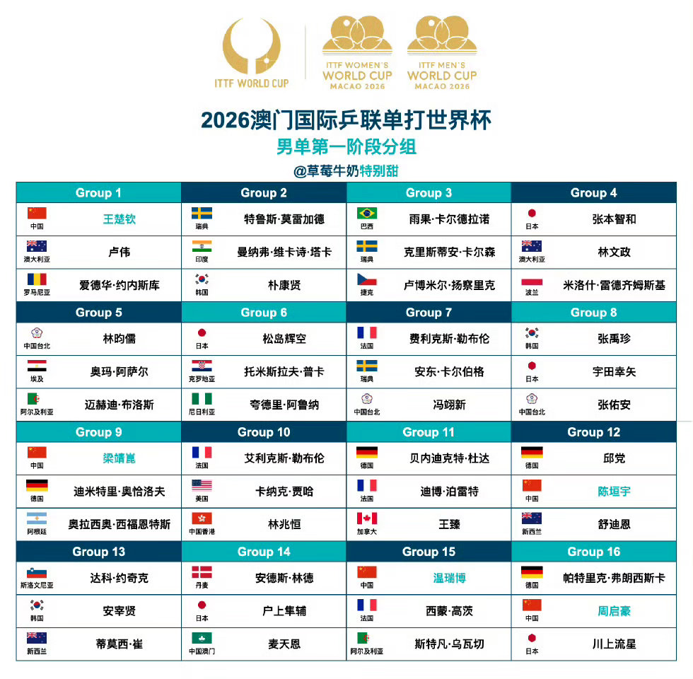 2026年澳门国际乒联单打世界杯男单第一阶段分组正式公布,国乒三大主力王楚钦、林诗栋、樊振东分别落入不同小组,将开启新一年的顶级乒乓对决。