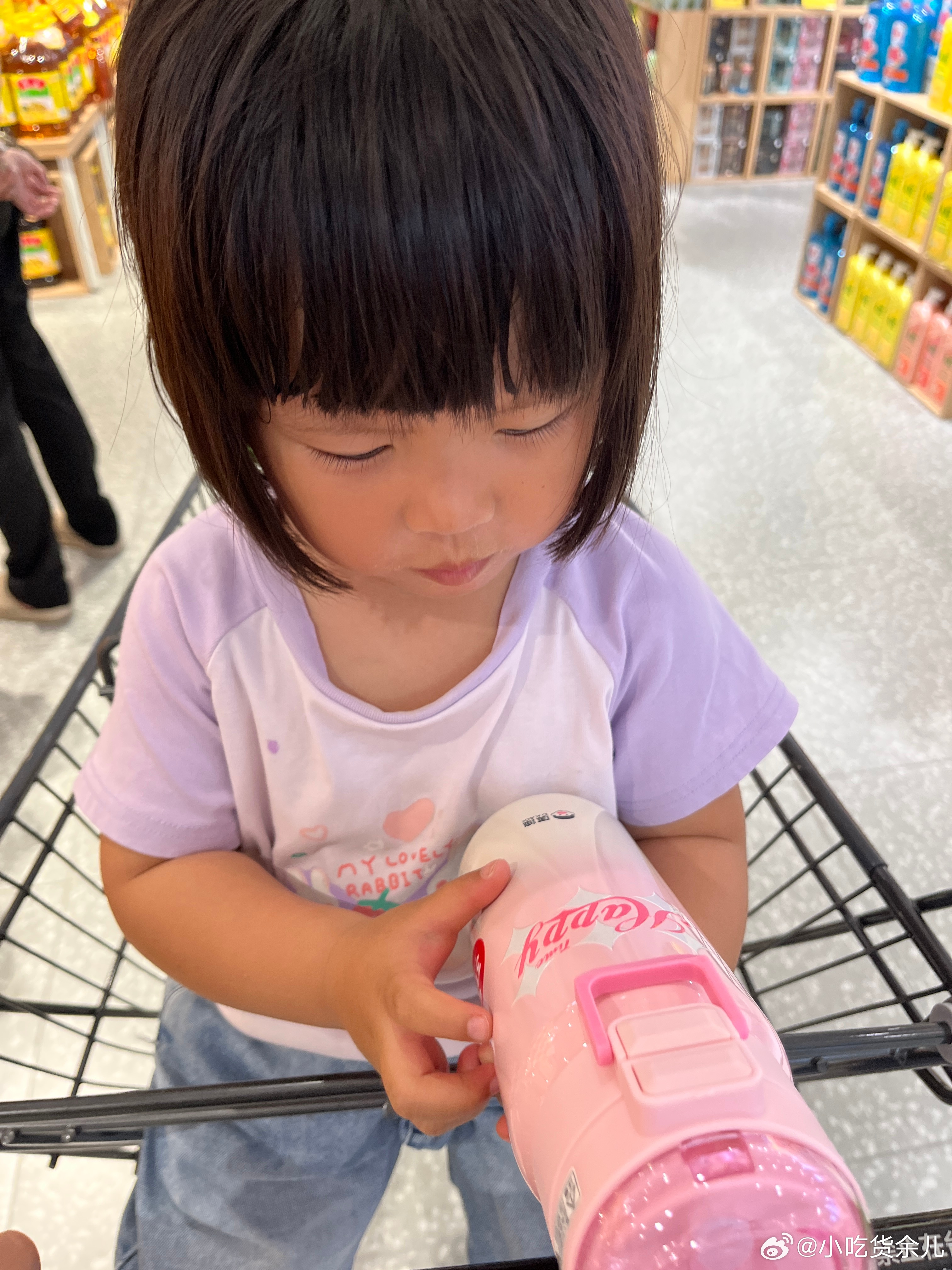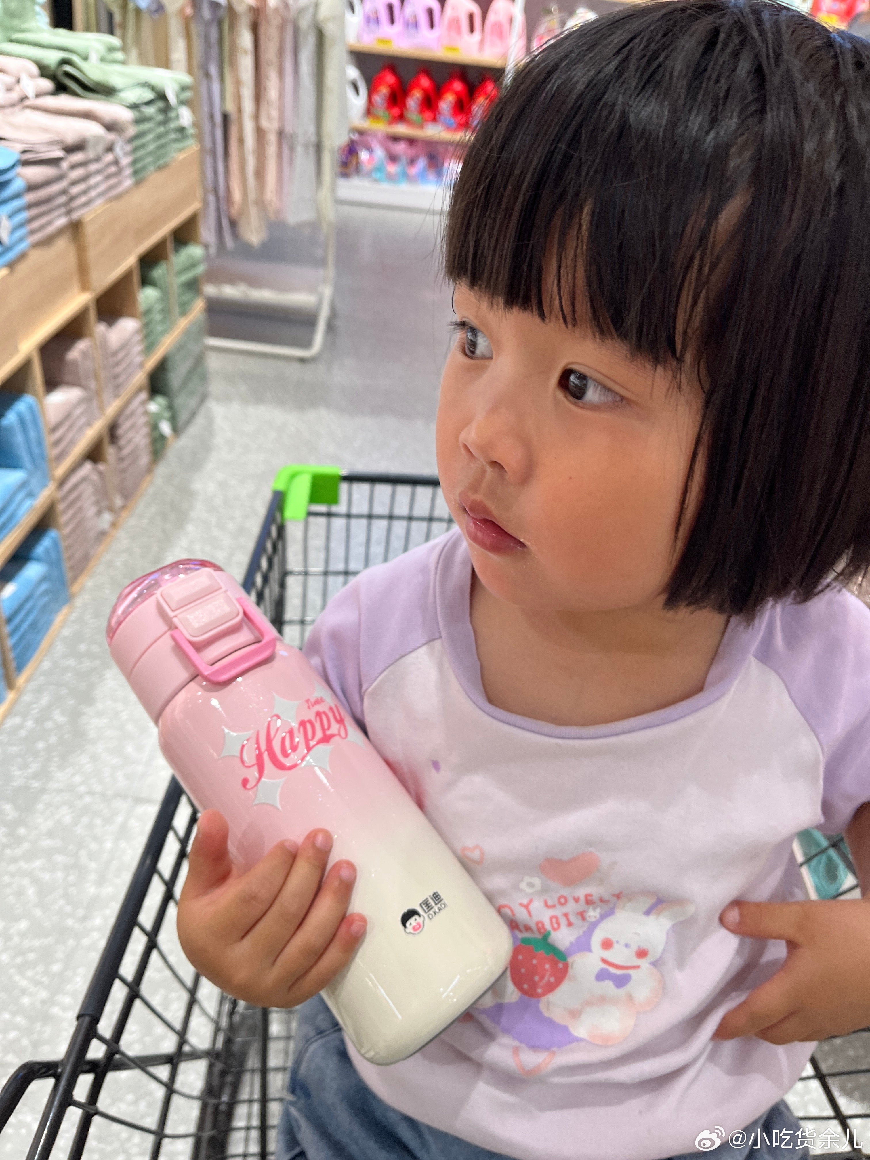 来超市给她买个新杯子,可喜欢这杯子了,我给她选了另外一个,她说不喜欢,要买这个,说这个很好看,可能是粉色的,又亮晶晶的,说就买这个,选定了。