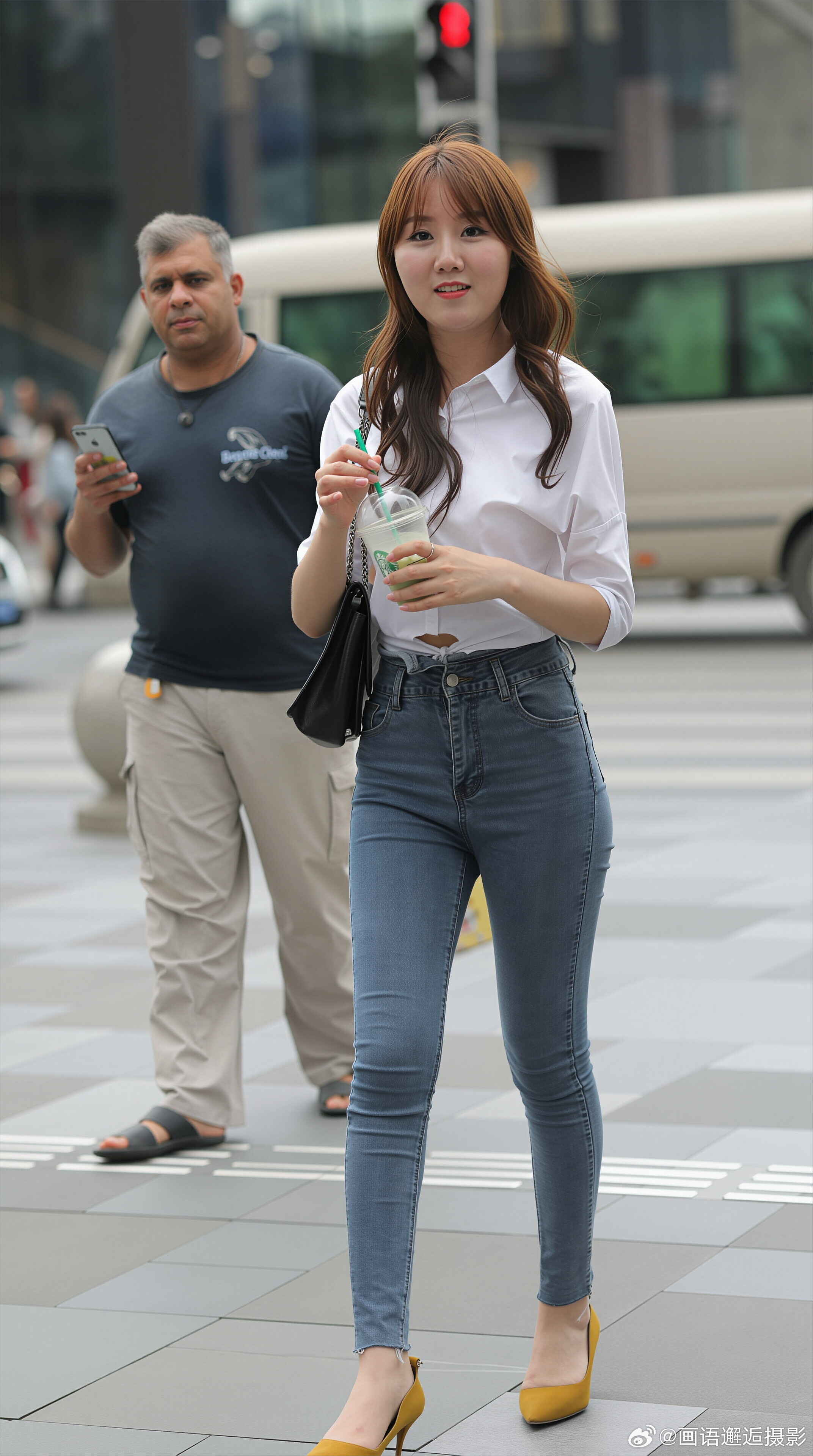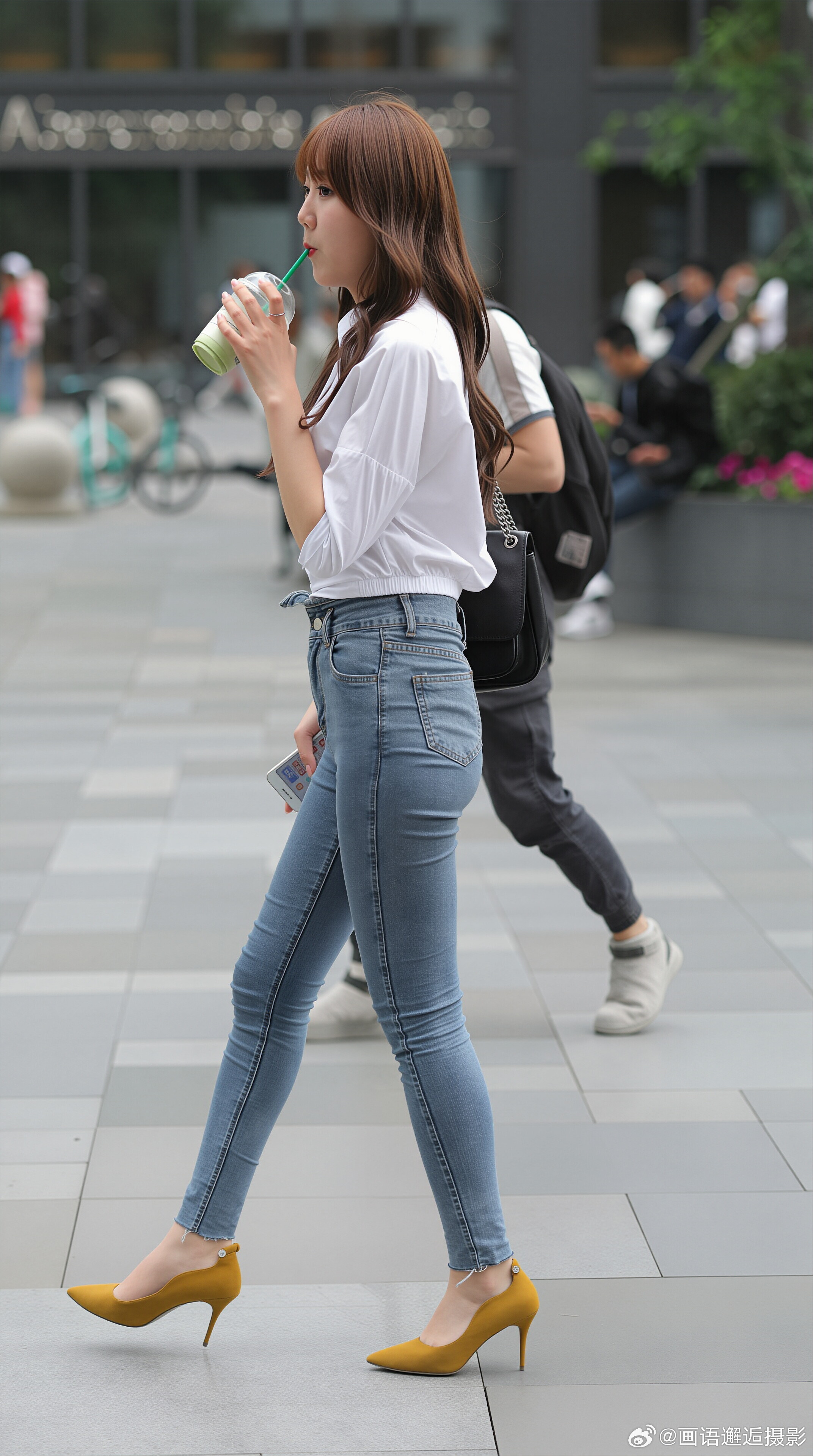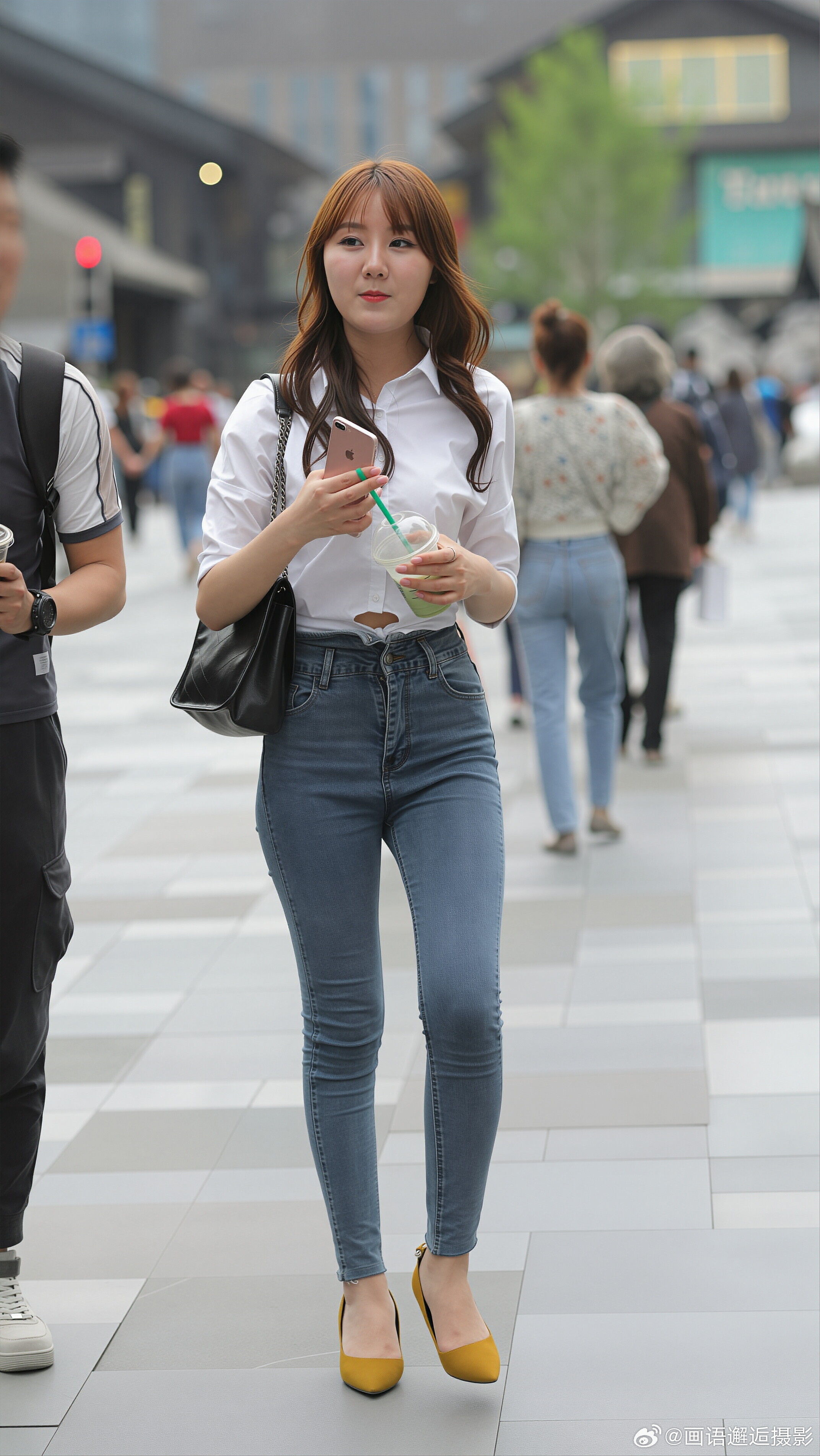 发现你的魅力 白衬衫配浅蓝牛仔裤,脚踩姜黄高跟鞋,简约干练又吸睛,职场通勤也能穿出时尚感。