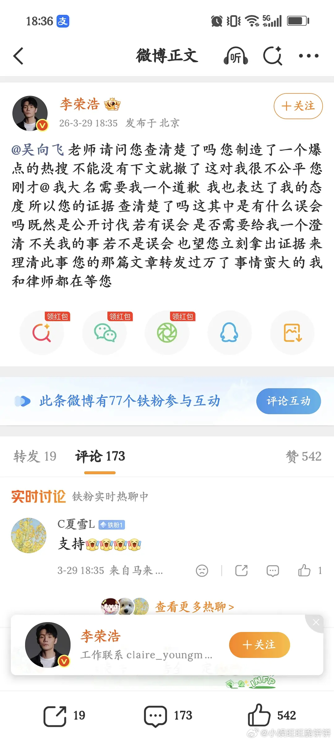 吴向飞3问李荣浩!这个瓜吃的也是够嗨了,没完没了。吴向飞再发文问李荣浩了三个