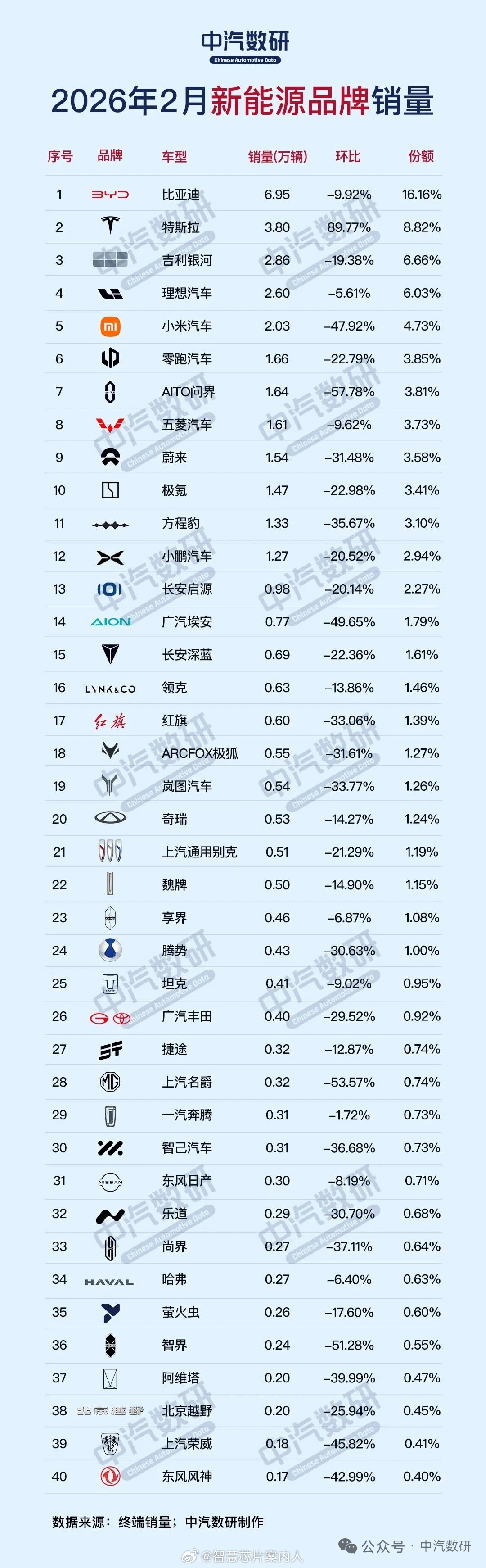 中汽数研统计了2月份新能源品牌出货量,排在前三的是比亚迪,特斯拉和吉利银河。