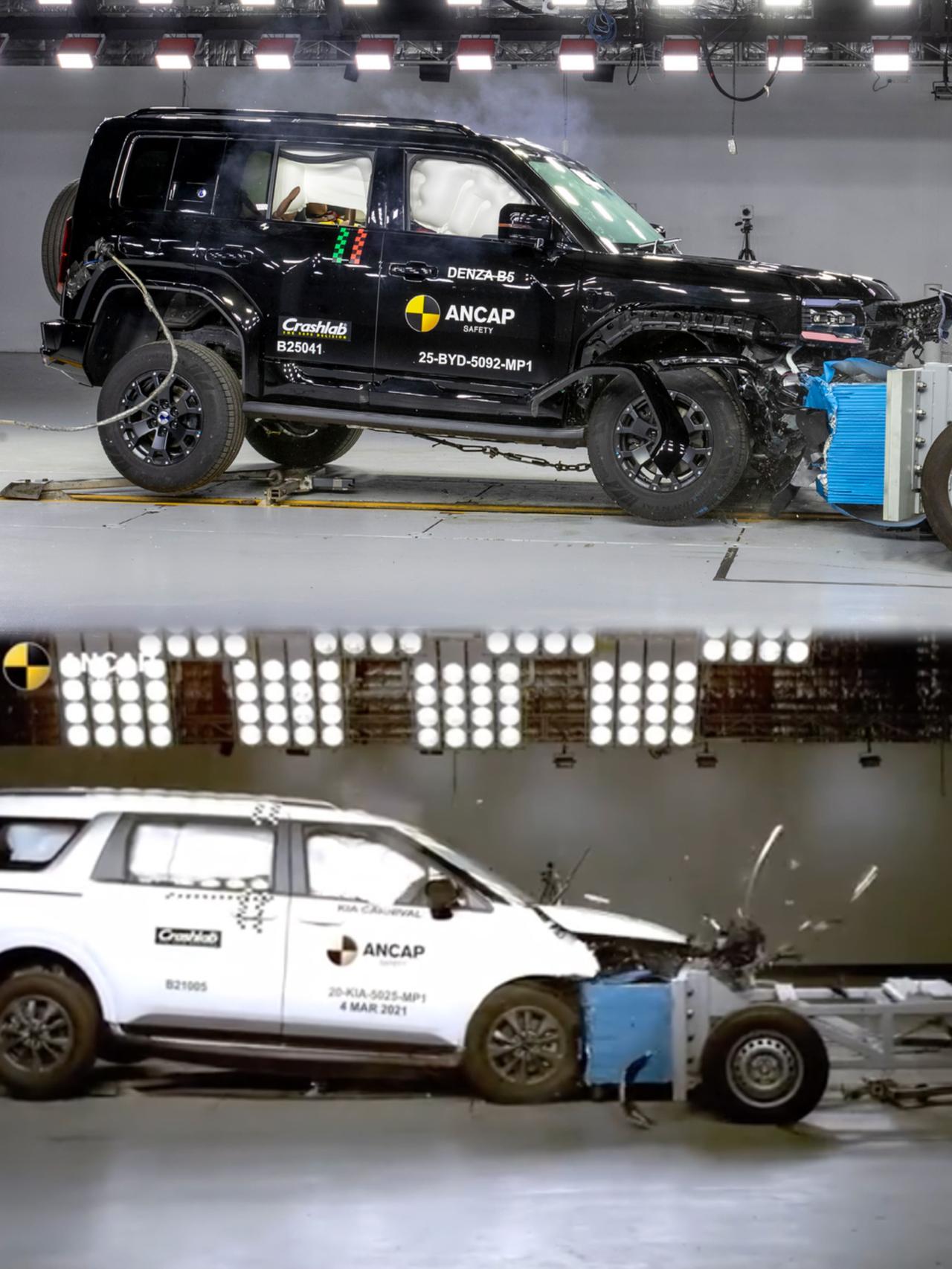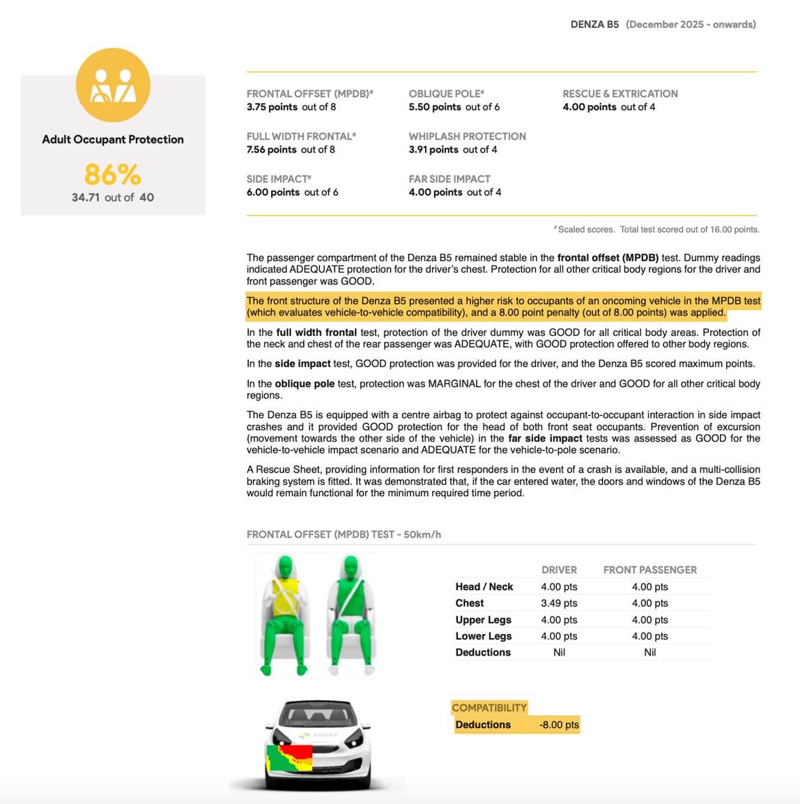撞飞对向车反被扣8分?方程豹豹5懵了,我们也懵了 在澳大利亚新车安全评鉴协会(ANCAP)的碰撞测试中,发生了一件咄咄怪事:方程豹豹5(海外名腾势B5)因车身“过于坚硬”,竟在碰撞兼容性项目上被扣满了8分。 这并非安全缺陷,而是实力的另类证明。在50km/h的正面偏置对撞测试中,豹5凭借非承载式车身和CTC电池底盘一体化技术,车头几乎纹丝不动,反而将模拟对向车直接“撞飞”出轨道。ANCAP认为,这种“不溃缩”的特性对对方车辆构成了更高风险,因此给出了兼容性零分的评价。 然而,这恰恰印证了其保护己方乘员的极致能力。最终,豹5依然以绝对实力拿下了ANCAP五星安全评级。其儿童乘员保护得分率高达95%,位列ANCAP历史测试车型前列;成人乘员保护得分率也达到了86%。在正面和侧面碰撞中,乘员舱结构稳定,假人关键部位数据优异。 这场“因强扣分”的风波,将一个深刻的议题摆在了公众面前:当车身刚性远超传统标准,安全评价体系是否也应随之进化?豹5用一份“矛盾”的成绩单,重新定义了硬派越野的安全边界,硬核实力树立安全新标杆。