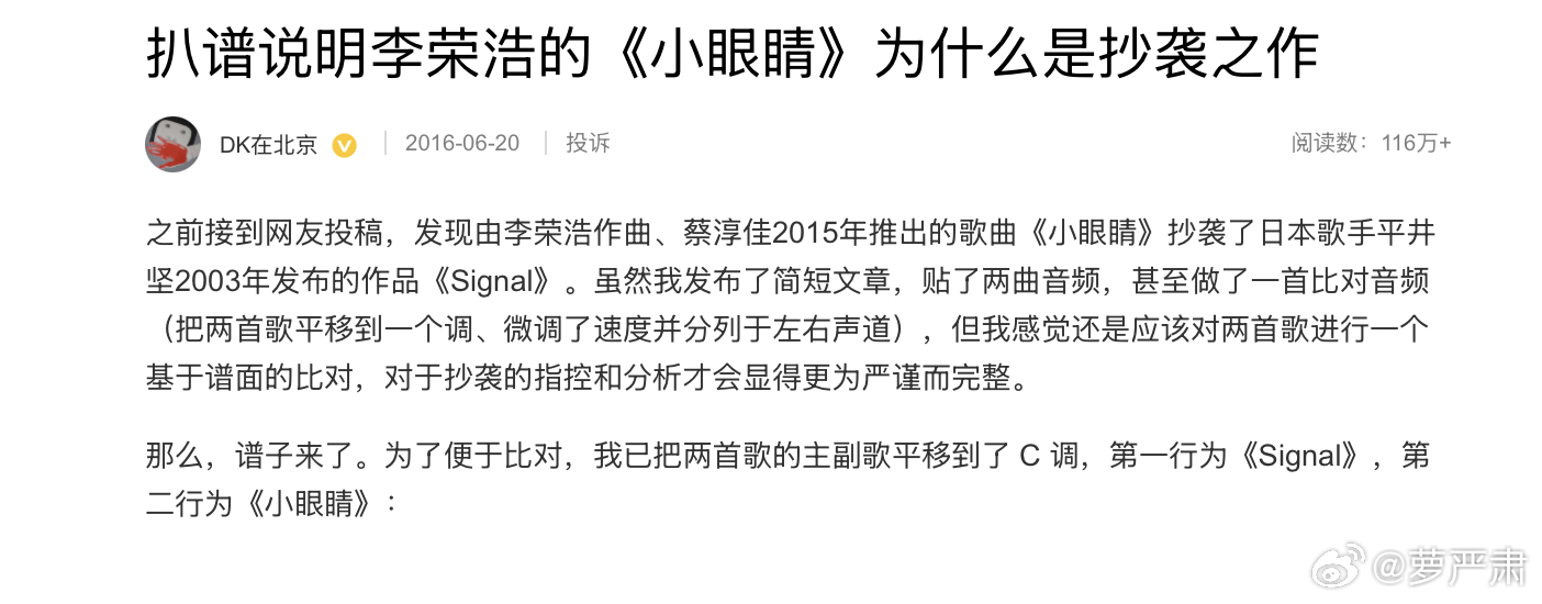 扒谱对比见→扒谱说明李荣浩的《小眼睛》为什么是抄袭之作