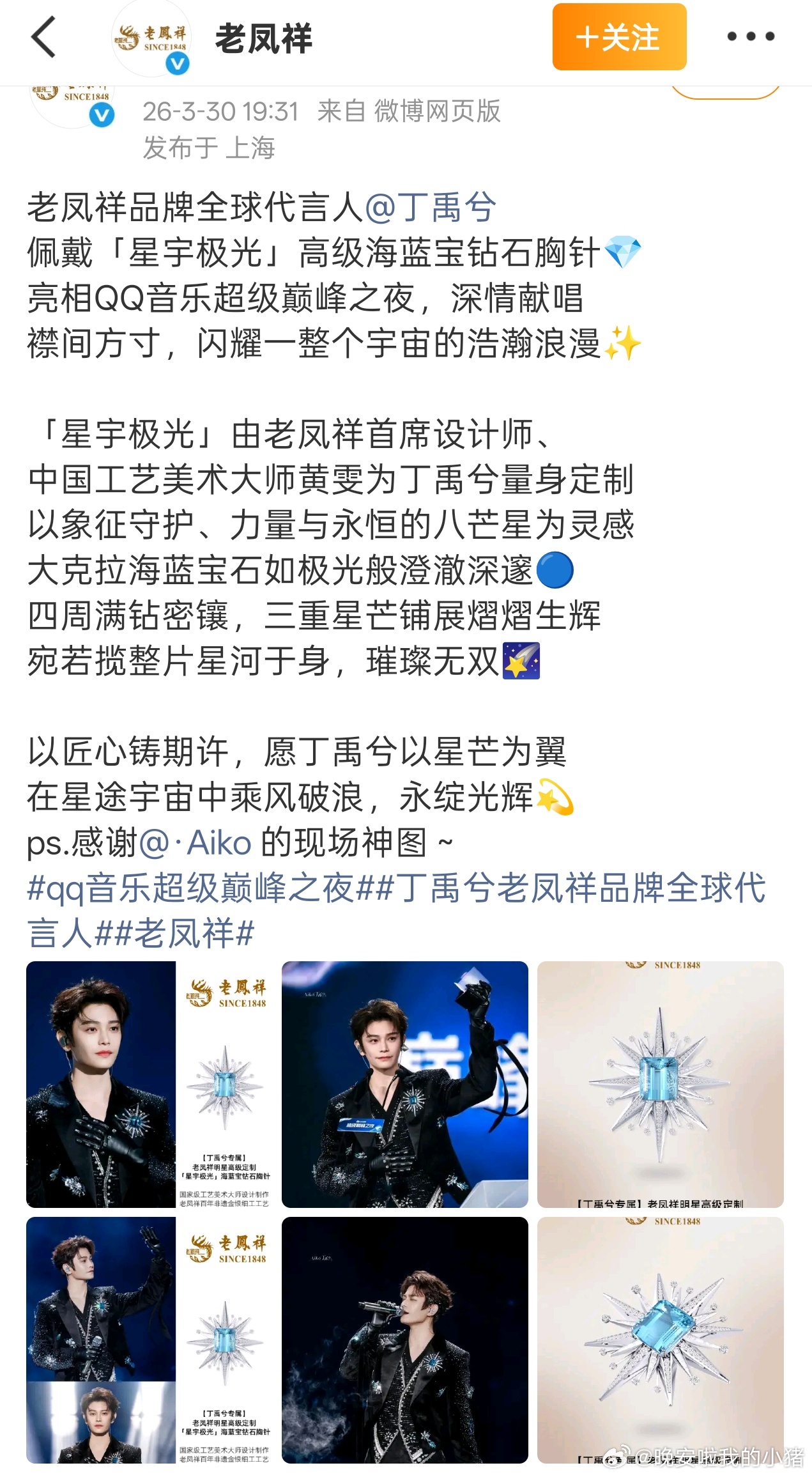 这款blingbling胸针的居然是老凤祥特意为全球代言人丁禹兮量身定制的,难怪