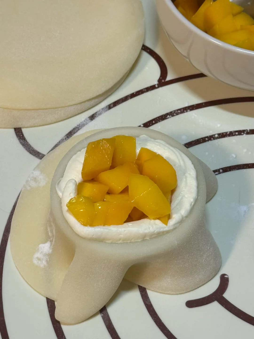 6.擀好的面皮放入模具中,挤上奶油、放入芒果,包包子一样包住,多余的用剪刀剪掉。做好的雪媚娘可以放冰箱冷藏一小时后再享用,口感会更好哦!