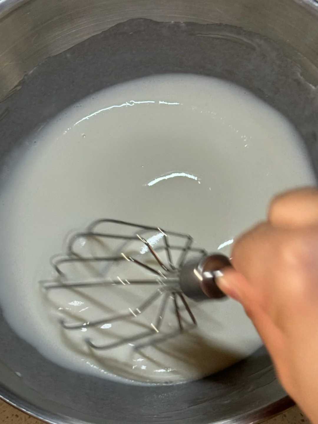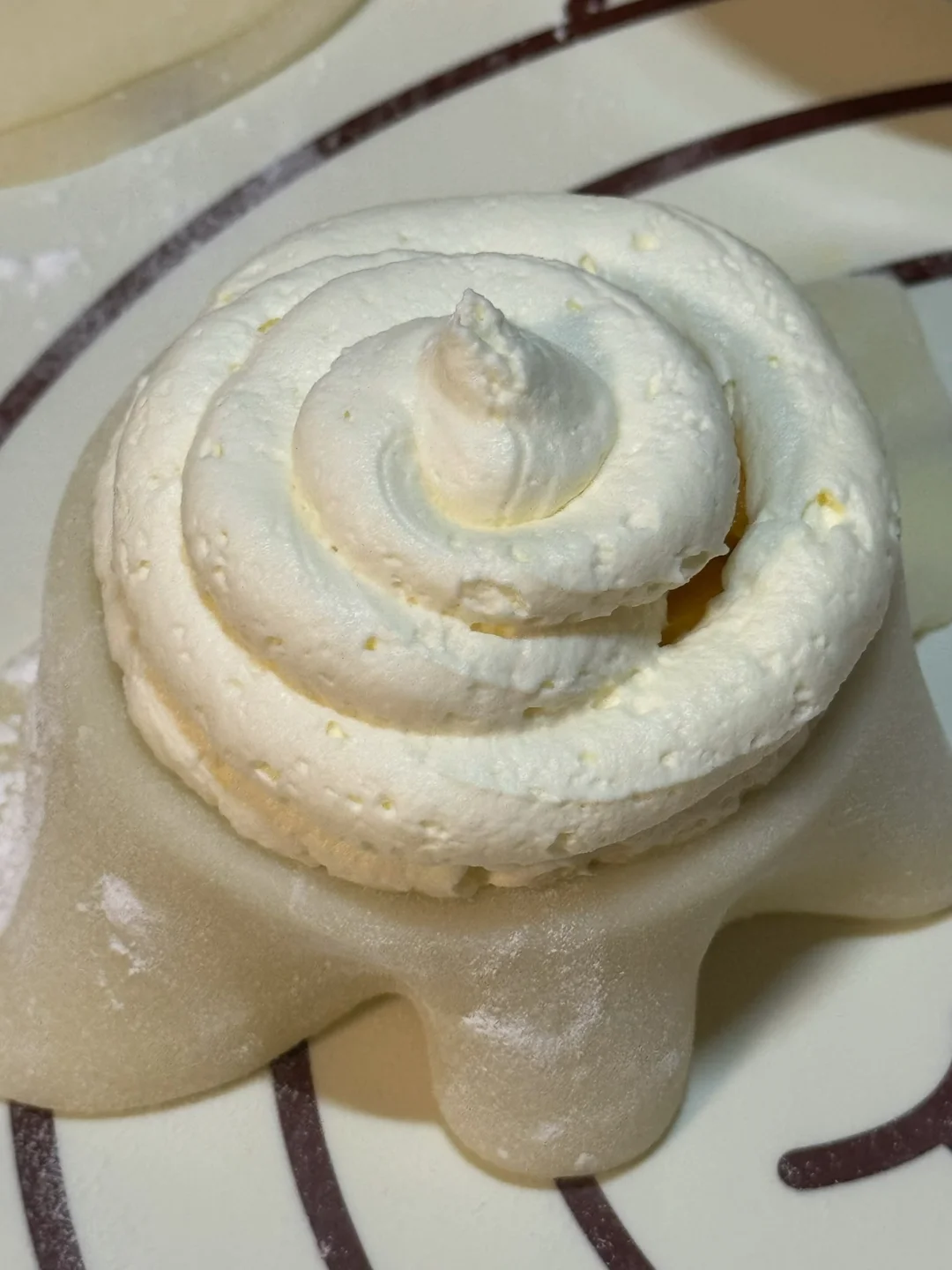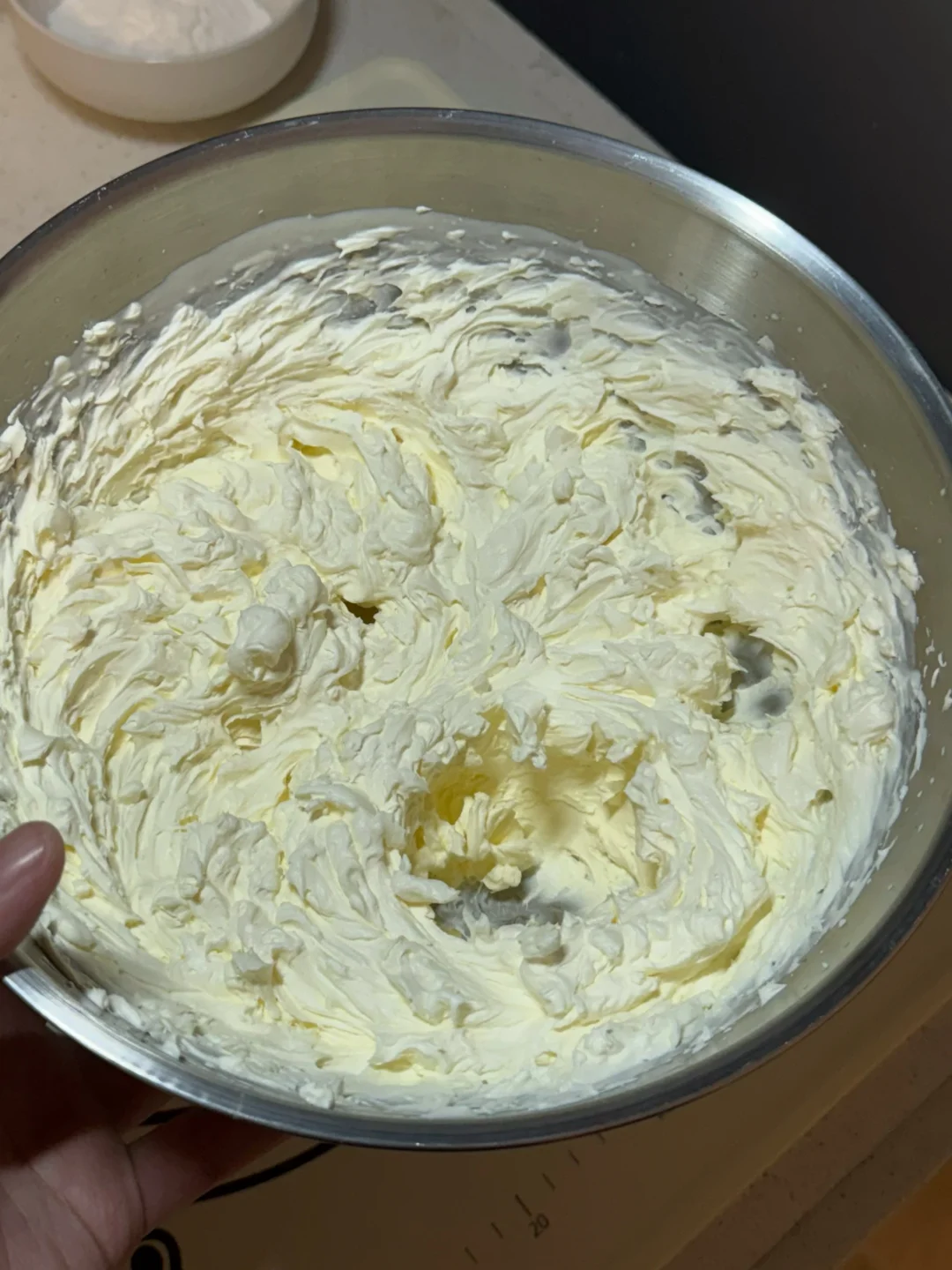 5.奶油350g,细砂糖15g打发至硬挺。