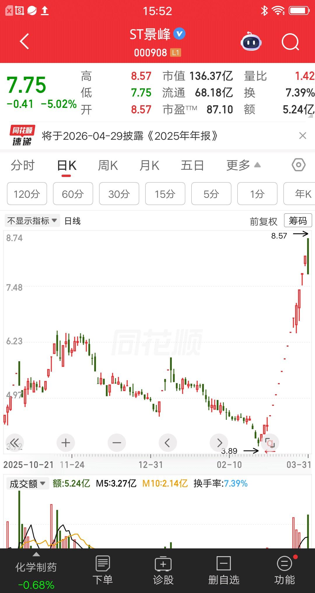 A股今天最惨的票诞生了,也是唯一的天地板个股,打板资金倒了大霉,亏麻了。该票集合竞价一字涨停,可以说非常强势呀,本以为能稳稳封住涨停,没想到开盘13分钟就炸板了。股价直线跳水杀跌,承接资金还是很强的,可惜卖盘更强大,最终彻底按死跌停了,上演天地板走势。全天成交额5.24亿,卖单还有0.38亿。 日线看这波上涨翻倍了,今日爆量跌停,大批追高资金被埋,就问你们惨不惨吧! 该票是一只ST股风险很大,咱们过过眼瘾就行了,千万别去参与。