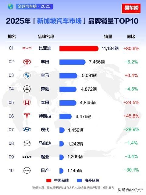 直到今天,很多羊胎盘,还觉得中国车企出海,靠的是便宜。可比亚迪在新加坡,等于把这种牧羊犬的偏见,当场击碎。 新加坡是什么地方?地方不大,门槛极高,对安全、能耗、可靠性挑得近乎苛刻,能在那里拿第一,靠的绝不可能只是低价。 2025年,比亚迪在新加坡,乘用车卖了11184辆,同比增长80.6%,蝉联全品牌销量冠军。电动巴士订单超500台,市占率超60%。纯电卡车五年累计注册1450台,同样排第一。  乘用车第一,说明消费者认;巴士第一,说明公共系统认;卡车第一,说明商业运营也认。连李显龙都公开发文感谢比亚迪为当地活动供电,这说明比亚迪进入的,不只是市场,而是城市运行体系本身。  说得再直接一点,真正让一些人不舒服的,从来不是比亚迪卖了多少车,而是中国企业开始在最挑剔的市场里,用技术、产品和体系能力拿走主导权。以前是别人定义标准,中国企业追着别人屁股跑。现在是中国品牌走进去、站住脚、拿第一。 比亚迪在新加坡赢的,不只是销量,而是脸面,是话语权,更是中国制造不再低头的底气。中国汽车,终于不用再靠哗众取宠低价刷存在感了,而是靠产品、技术、规模和体系能力,实打实的赢得了国际社会和西方国家的尊重!用实力助力全球绿色出行!