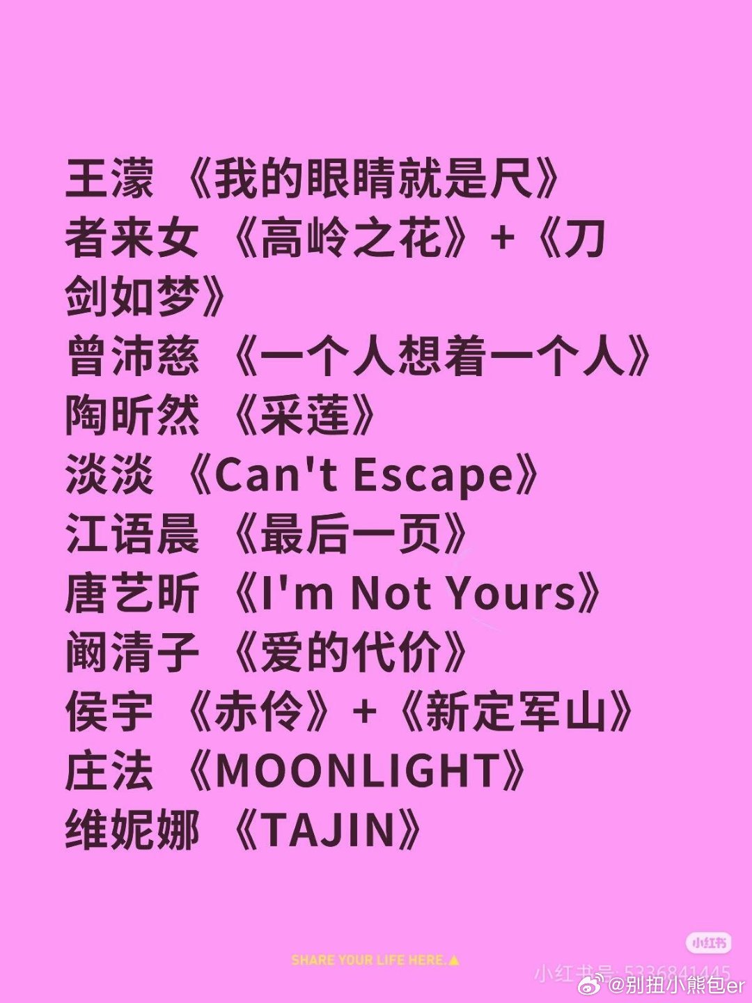 乘风2026初舞台歌单正式官宣!具体歌曲名单如下!萧蔷 《一帘幽梦》李心洁 《自由》范玮琪 《如果的事》李小冉 《我要我们在一起》赵子琪 《危险派对》徐洁儿 《现在不跳舞要干嘛》温峥嵘 《剪》谢楠 《逆光》乌兰图雅 《站在草原望北京》叶一茜 《听海》王濛 《我的眼睛就是尺》者来女 《高岭之花》+《刀剑如梦》曾沛慈 《一个人想着一个人》陶昕然 《采莲》淡淡 《Can't Escape》江语晨 《最后一页》唐艺昕 《I'm Not Yours》阚清子 《爱的代价》侯宇 《赤伶》+《新定军山》庄法 《MOONLIGHT》维妮娜 《TAJIN》陈凯琳 《Me Too》代斯 《IMMA GET IT》何宣林 《why oh why》万千惠 《暗香》孙怡 《Why Why Why》张慧雯 《跟着你到天边》徐梦洁 《Sugar》张月 《Interstellar》陈瑶 《恋爱告急》黄灿灿 《Say U Love Me》张艺上 《爱丫爱丫》安崎 《花儿为什么这样红》你最期待谁?