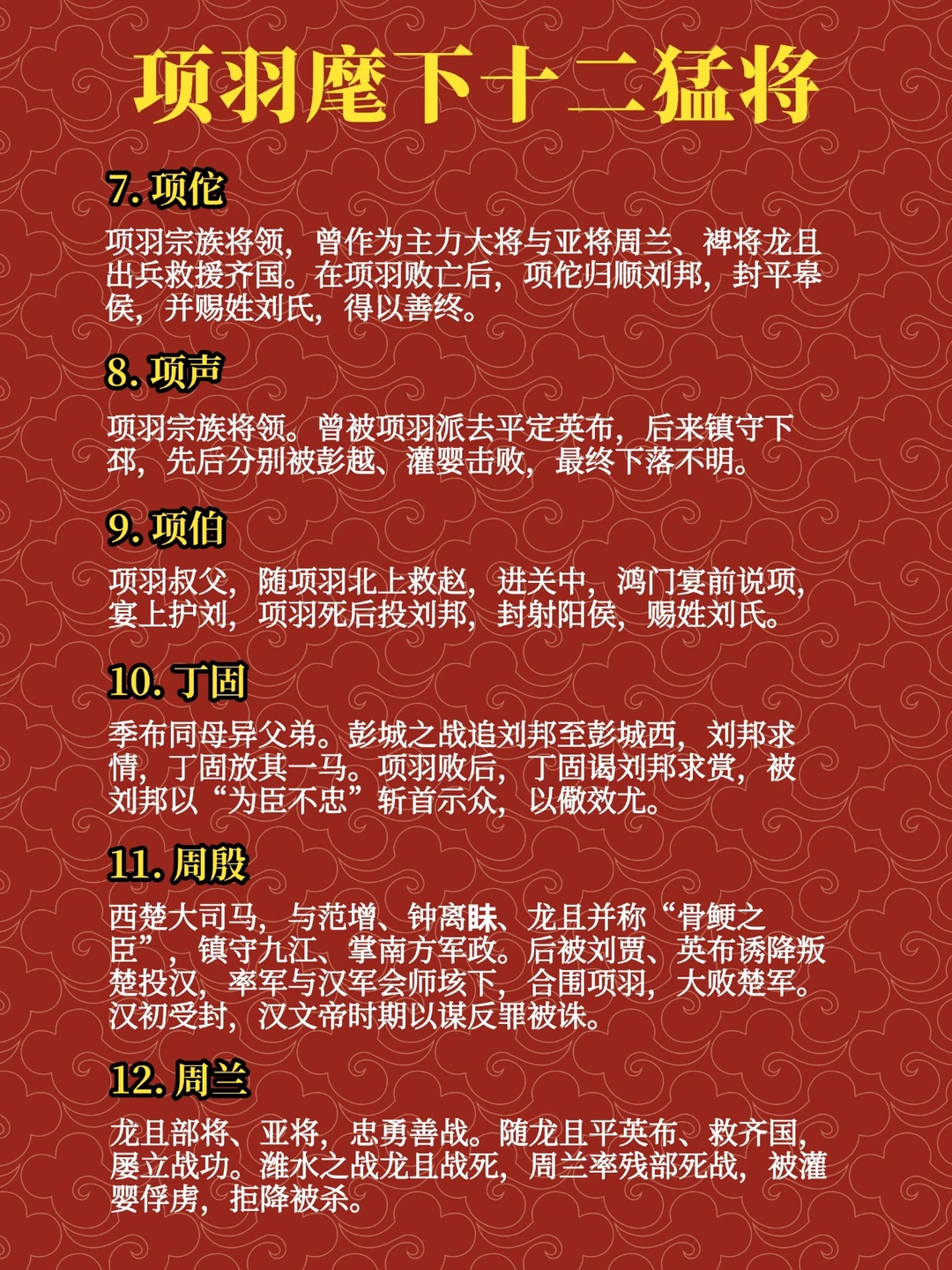 项羽宗族将领,曾作为主力大将,与裨将龙且、亚将周兰一同出兵救援齐国,立下不少战功。项羽败亡后,归顺刘邦,被封为平皋侯,还获赐姓刘氏,得以善终。