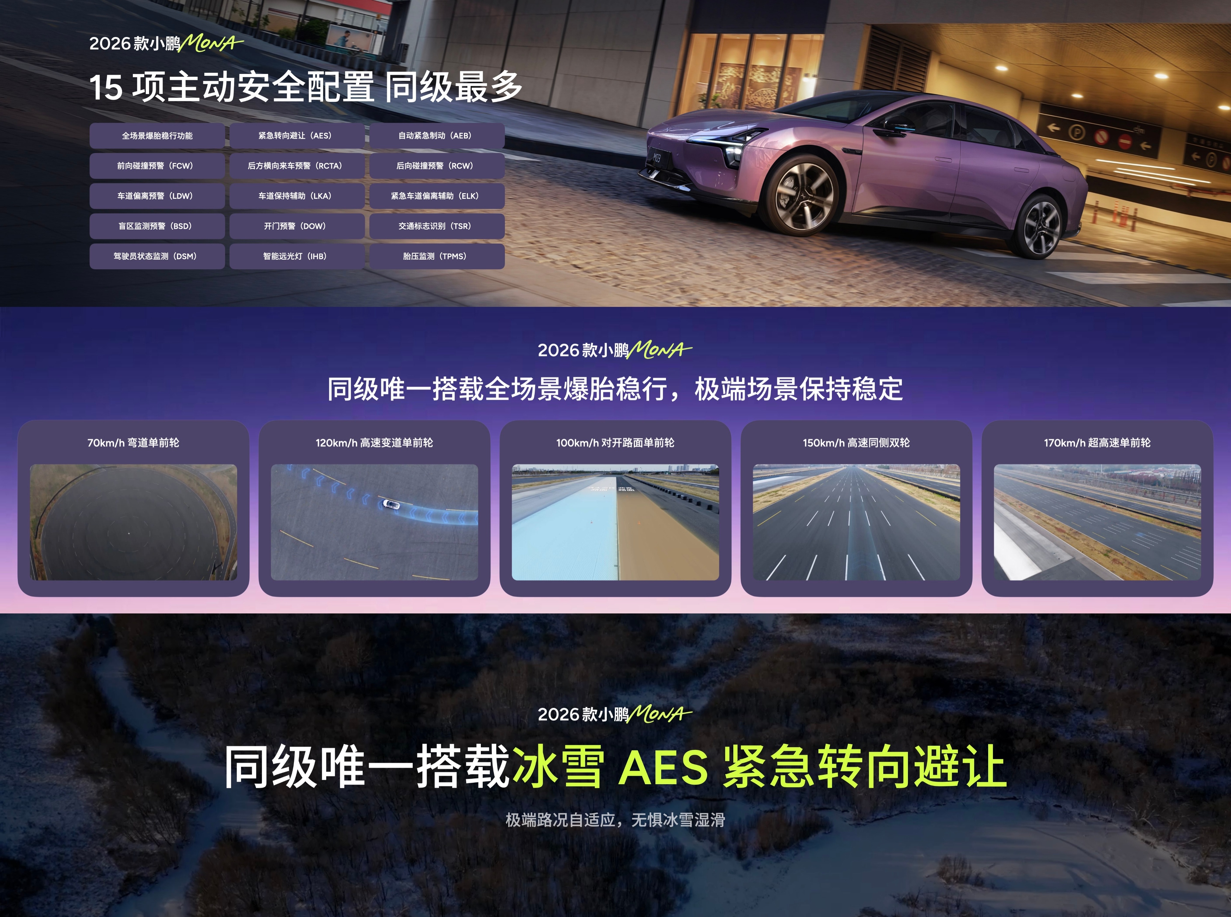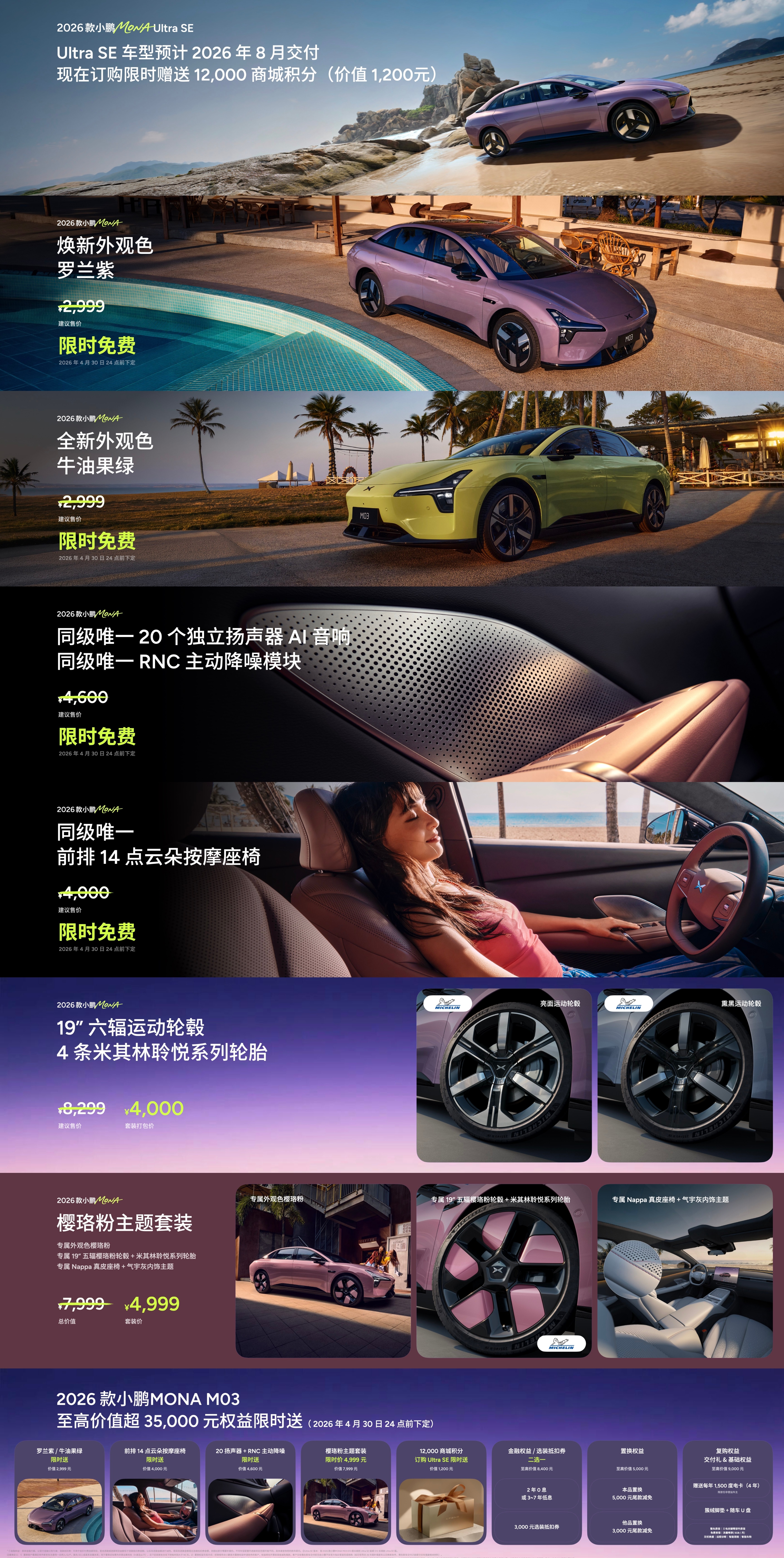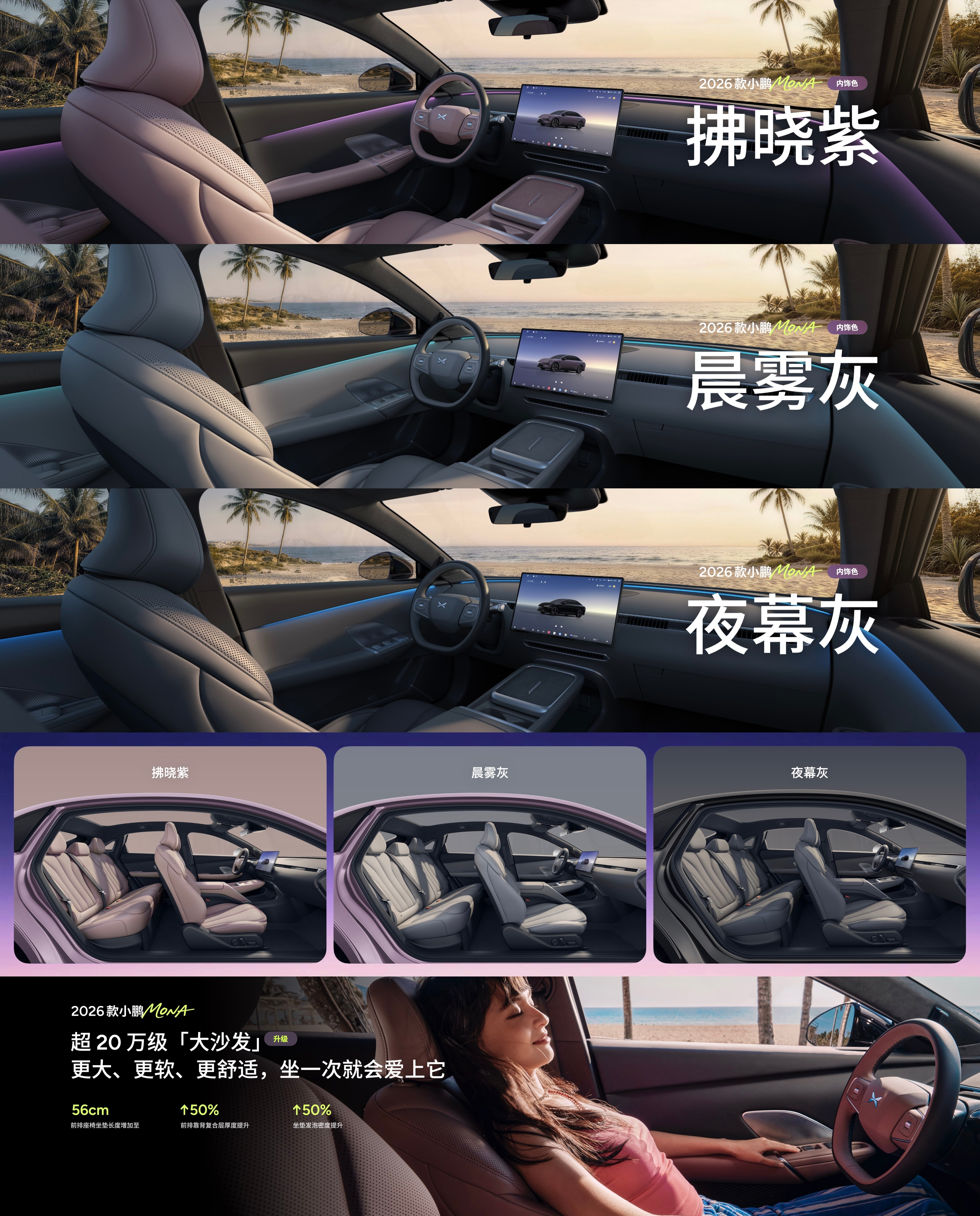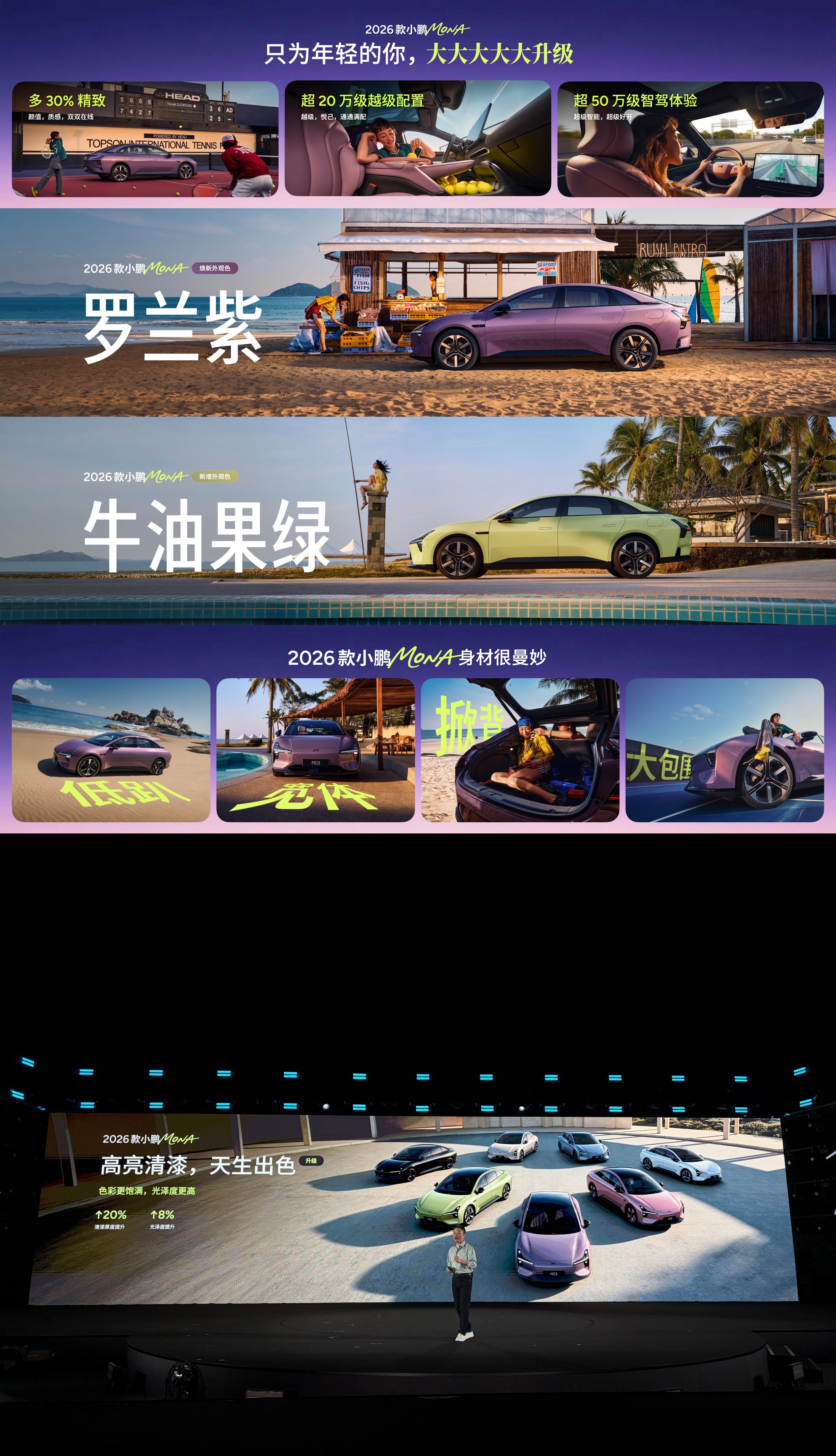 2026款小鹏MONA M03上市啦!6款版型,11.98万起,各种限时免费,产品力是全面提升,各种同级唯一,还全球范围内首次把1500TOPS的有效算力引入到2万美元级别!新款MONA M03明显变得更时尚更吸引眼球了,不管是外观还是内饰,都让人耳目一新,罗兰紫、牛油果绿两款新配色都很美!樱珞粉主题套装尤其靓丽,我相信肯定会有更多女性用户选择MONA M03,MONA M03可以说是小鹏的“印钞机”车型,非常成功,非常完美的家用代步工具!欧阳娜娜同款小鹏MONA起售价11.98万2026款小鹏MONA大大大大大升级