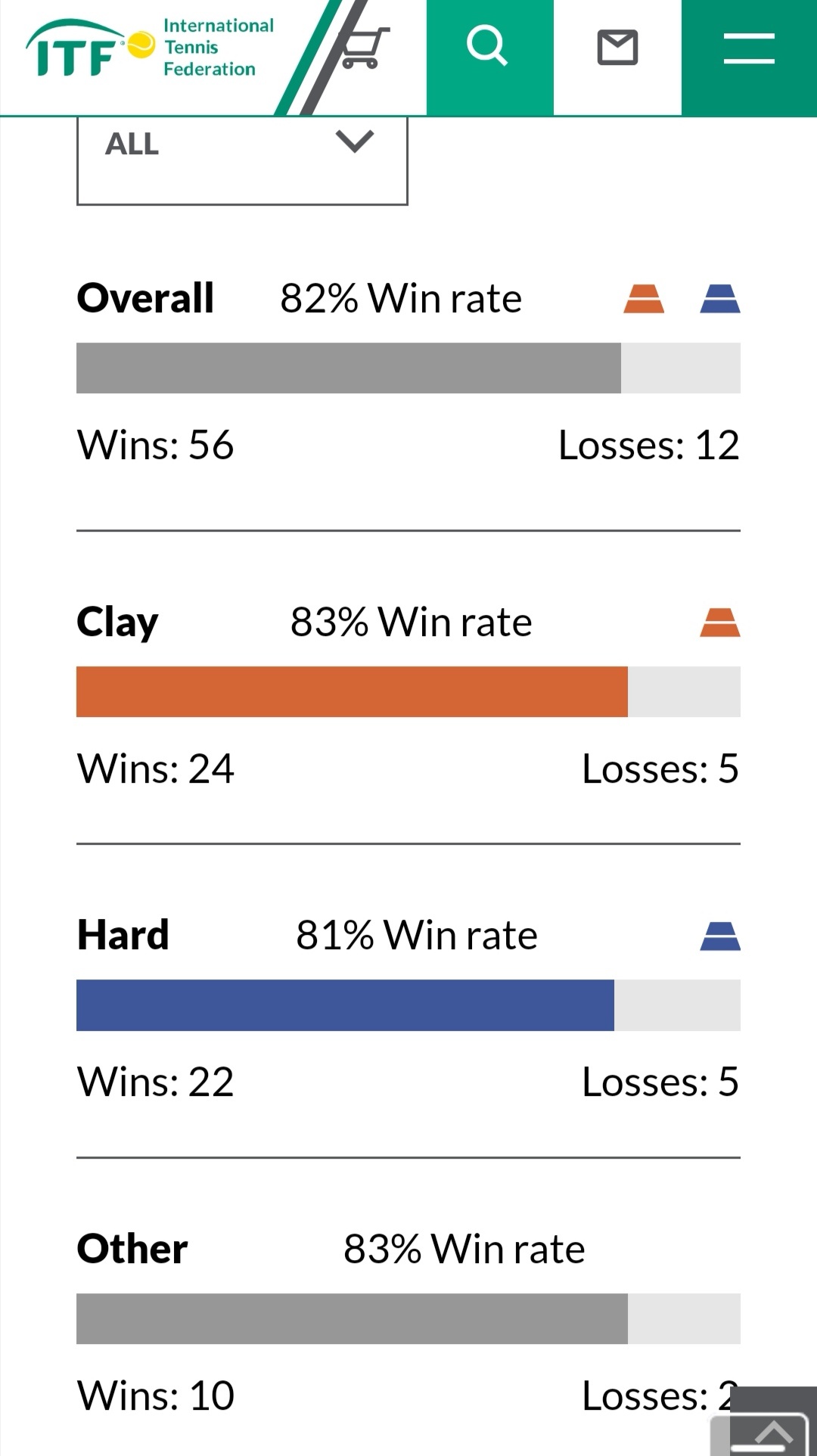 图1-2 你闹一共只打了四年ITF青少年赛,56胜12负,总胜率82%,各场地胜率均衡,没打过草地赛。他在2003年2月达到ITF单打最高排名24,当时15岁9个月,由于他之后马上拿到了第一个希望赛冠军,进入ATP排名系统,就直接转职,不打青少年赛了。具体战绩如下↓